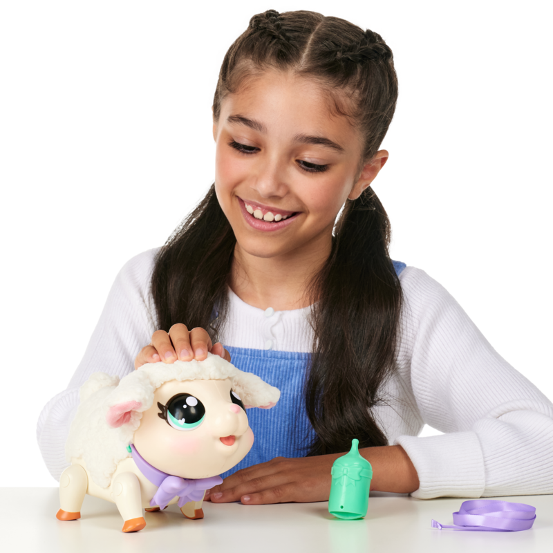 With over 25+ sounds and reactions, Snowie moves and sounds just like a real baby Lamb. Feed her with her bottle and give her a cuddle as she reacts to your touch. Watch her tail wag as she walks! Snowie makes so many funny and sweet sounds - she baa's, feeds, giggles, burps, sniffs, sneezes, and may even let out a cute fart, too!