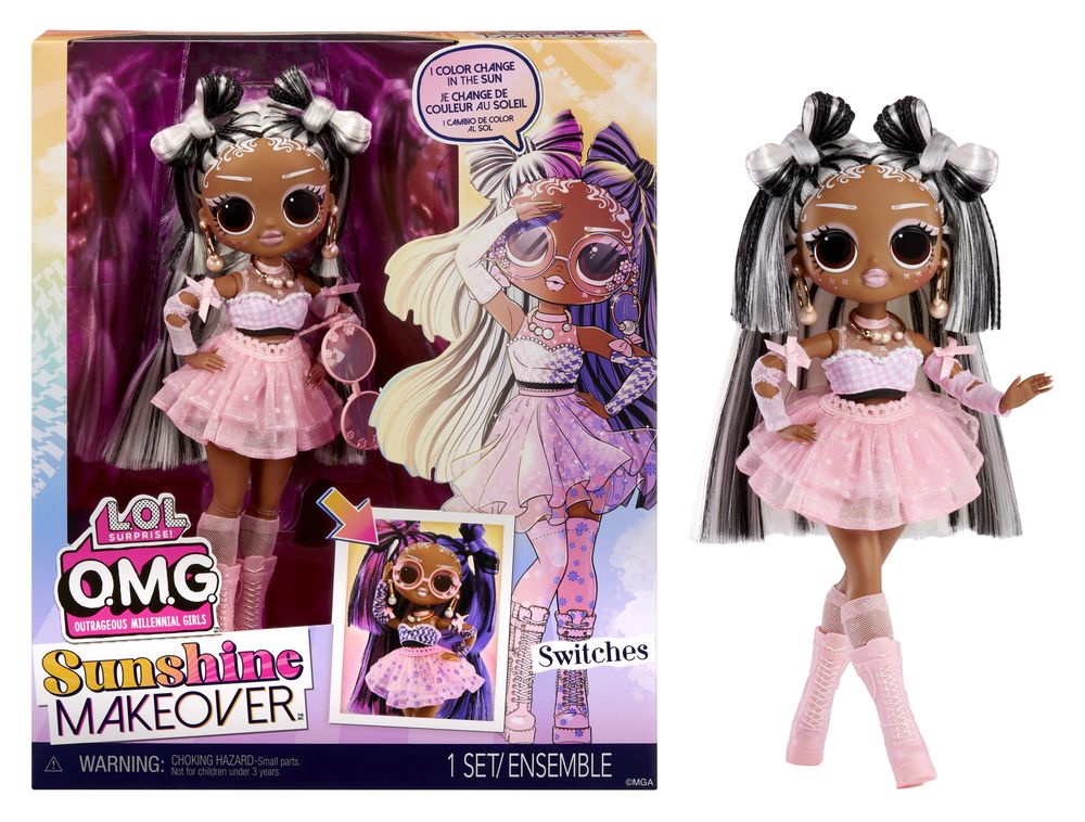 Introducing LOL Surprise O.M.G. Sunshine Makeover™ fashion doll Switches! When it comes to pastel pink, Switches knows how to rep her favorite color in the most unexpected ways. She loves to switch up her fashions between her preppy and bold looks and is into all the stylish details. Unbox multiple surprises with Switches including color changing fashions and stylish accessories. Bring Switches outside during any time of day whether it’s sunny or cloudy, or even indoors next to a window, for a glamorous makeover. Watch the magic happen before your eyes and see one side of her hair color change from white to purple. Can you guess what the other side of her white hair will color change to? Don’t forget to check out the color change surprises on her fierce fashions that gradually reveal once outside. When exposed to light, Switches’ matching checkered top and sleeves dramatically changes color from pink to purple, while her fashionable skirt, high socks, and boots all have purple floral prints that come to life. You can repeat the color changes as many times as you’d like! Head back indoors to return Switches to her original look and go back outside or by a window to experience her gorgeous transformations again. This Sunshine Makeover™ doll has stunning features, beautiful hair, and is articulated with tons of poses. Pro Tip: Hands are removable for easy dressing. Collect all 3 LOL Surprise OMG Sunshine Makeover™ fashion dolls: Bubblegum DJ, Sunrise, and Switches.