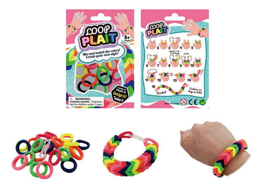 Loop Plaits are fabric, elastic rings that you can loop and plait together to make your own imaginative and colourful bracelets. Each packet contains 24 loops and a plastic fastener.
