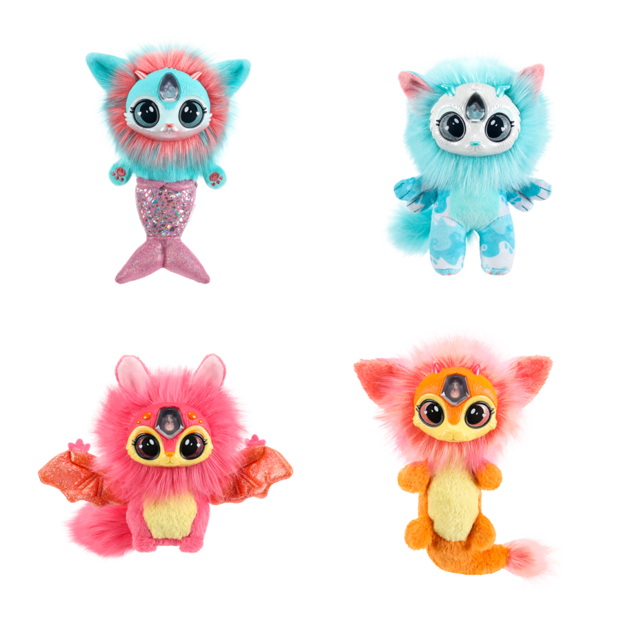 Across the line, there are 2 water Mixie Plushies and 2 fire Mixie plushies to create! Each non-electronic Mixie Plushie also has a special, lenticular Gem on their forehead – just tilt the Mixie Plushie forwards and backwards to see the elemental magic in their Gem!
