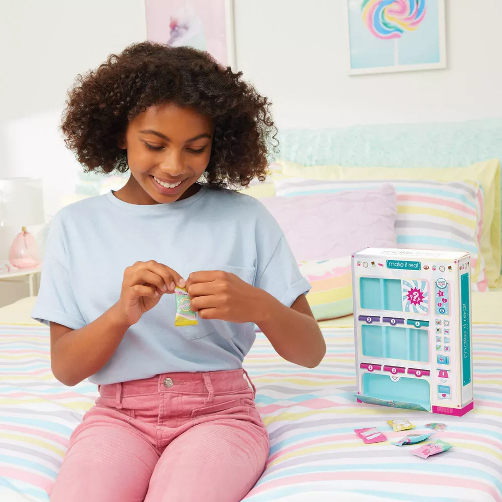 Hungry for some DIY fun? Make 5 snack-themed bracelets after dispensing snack bags from this uber cute Make It Real vending machine. Pull the tabs to dispense the DIY treat bags containing bracelet materials. Continue to reveal surprises behind hidden compartments for extra treats! What will your bracelet look like? Stop by the snackers vending machine to find out! This DIY bracelet kit vending machine makes an ideal gift for creative tweens, whether it's for a birthday bash, holiday, or just because! Perfect for ages 8+. Unique and super trendy, this set is sure to please young fashionistas and encourage creativity.