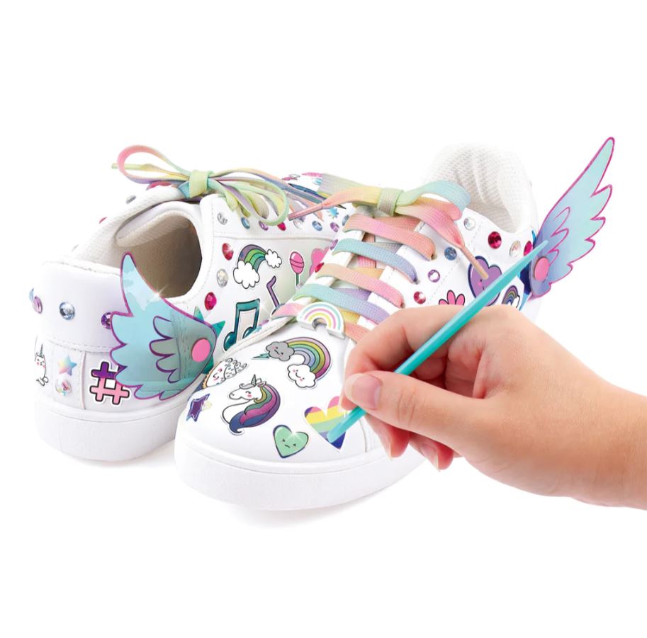 Includes bead charms, shoelaces, and wings. (Adhesive peels away- remove any excess with warm water) Not recommended for some shoe fabrications. Ask a parent or guardian’s permission before decorating shoes.