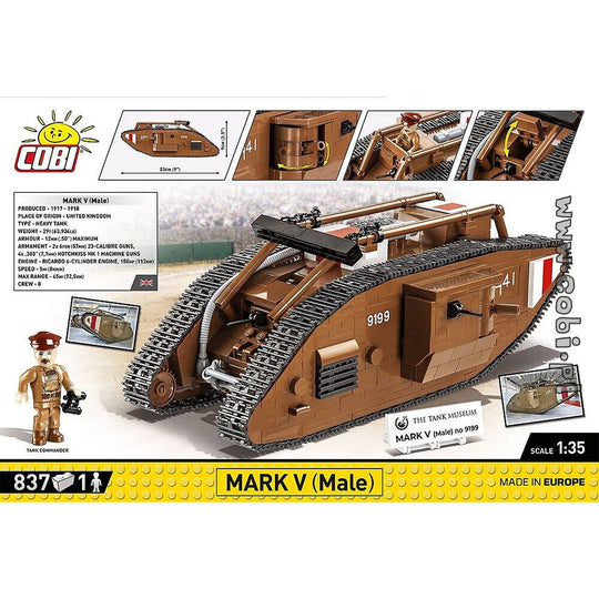 A carefully reproduced model of the MARK V (Male) tank, number 9199, consists of 837 COBI construction blocks and measures 29 cm in length. Thanks to the modeling scale of 1:35 the model fits COBI figures and other vehicles released in this scale. The tank is equipped with working track traction, rotating cannons and opening hatches. Markings and emblems are made of colored blocks and permanent prints that do not wear off even during intense play. The set includes a figure of a tank commander and a plate with the name of the set and the logo of The Tank Museum.
