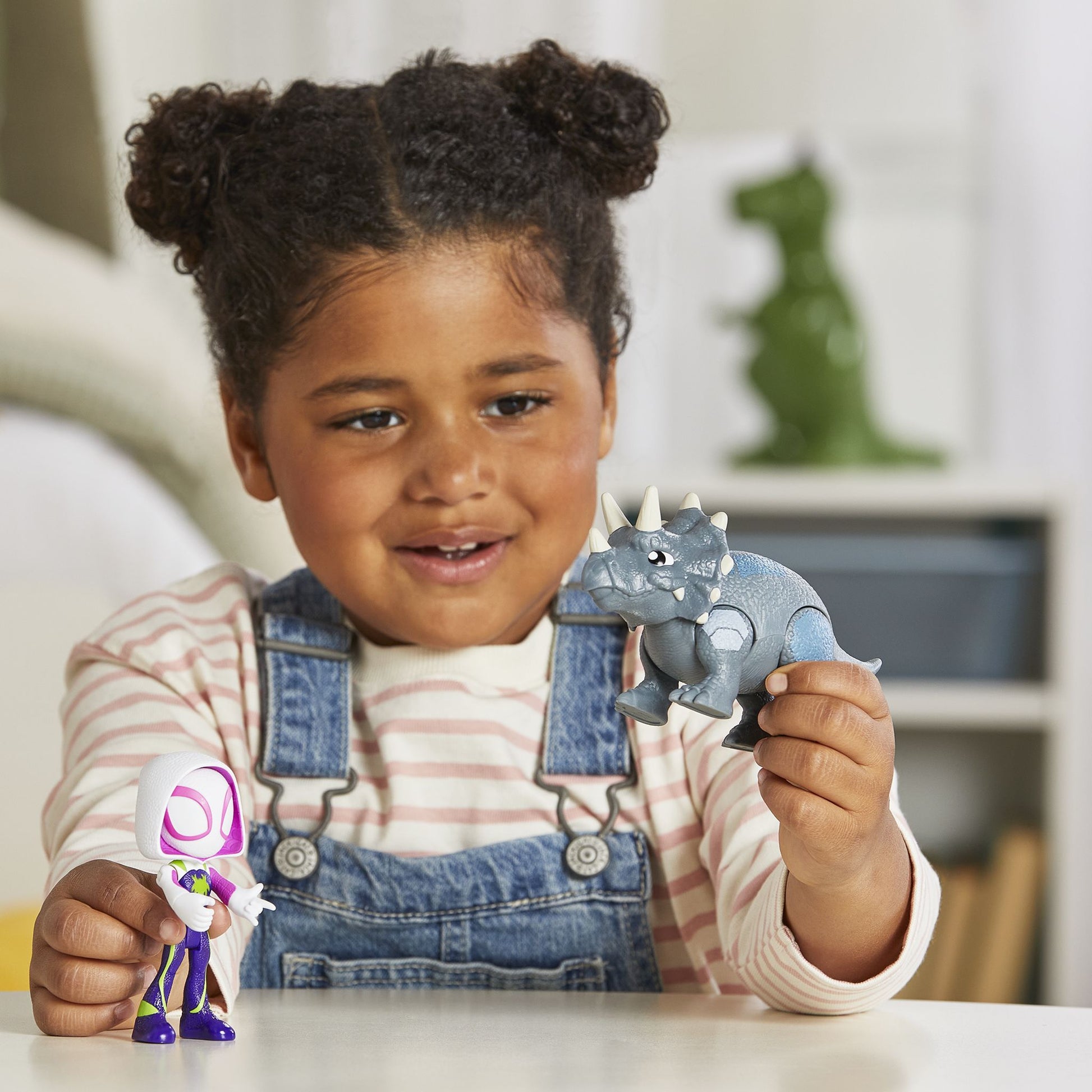 INCLUDES POSEABLE 4-INCH HERO FIGURE: Each set includes a Ghost-Spider action figure complete with the latest Dino-Webs suit deco