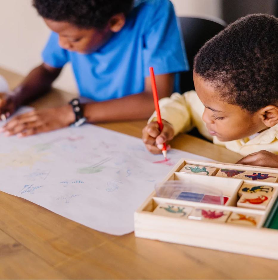 Imagine a landscape full of dinosaurs! Children love using the 8 detailed dino stamps and a two-color inkpad. It's fun creating countless scenes, and coloring in the pictures with the 5 colored pencils! This well-crafted set is conveniently contained in a sturdy wooden box for organizing and storage. It's a tremendous value that children will use over and over again! Washable, non-toxic kid-friendly ink.