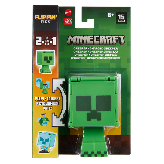 Calling all fidgeters! Get ready for nonstop action with Minecraft Flippin' Figs collectible figures! These 3.75-in scale Flippin' Figs can easily flip and transform back and forth from one figure to another. Just flip up the panels on each figure's oversized head and lock them in place to reveal a different Minecraft figure in seconds for 2-in-1 play that's meant to be repeated again and again!