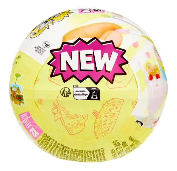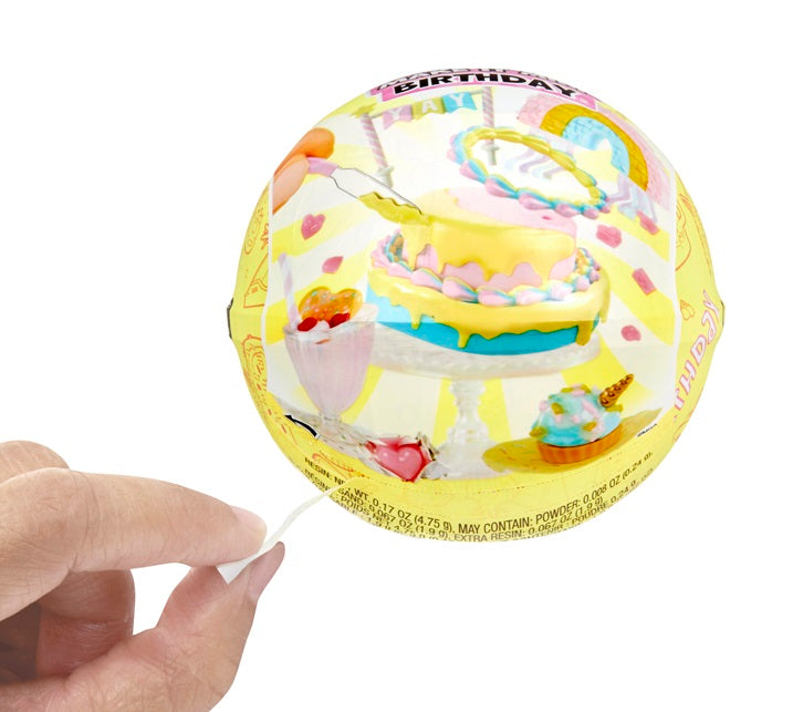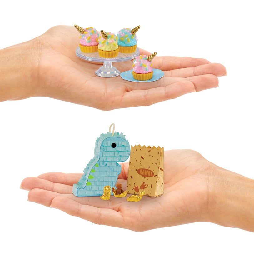 Each ball comes with realistic mini items to make your own mini replicas of your favorite party essentials that match one of three party themes: Rainbow, Dino, and Tropical.