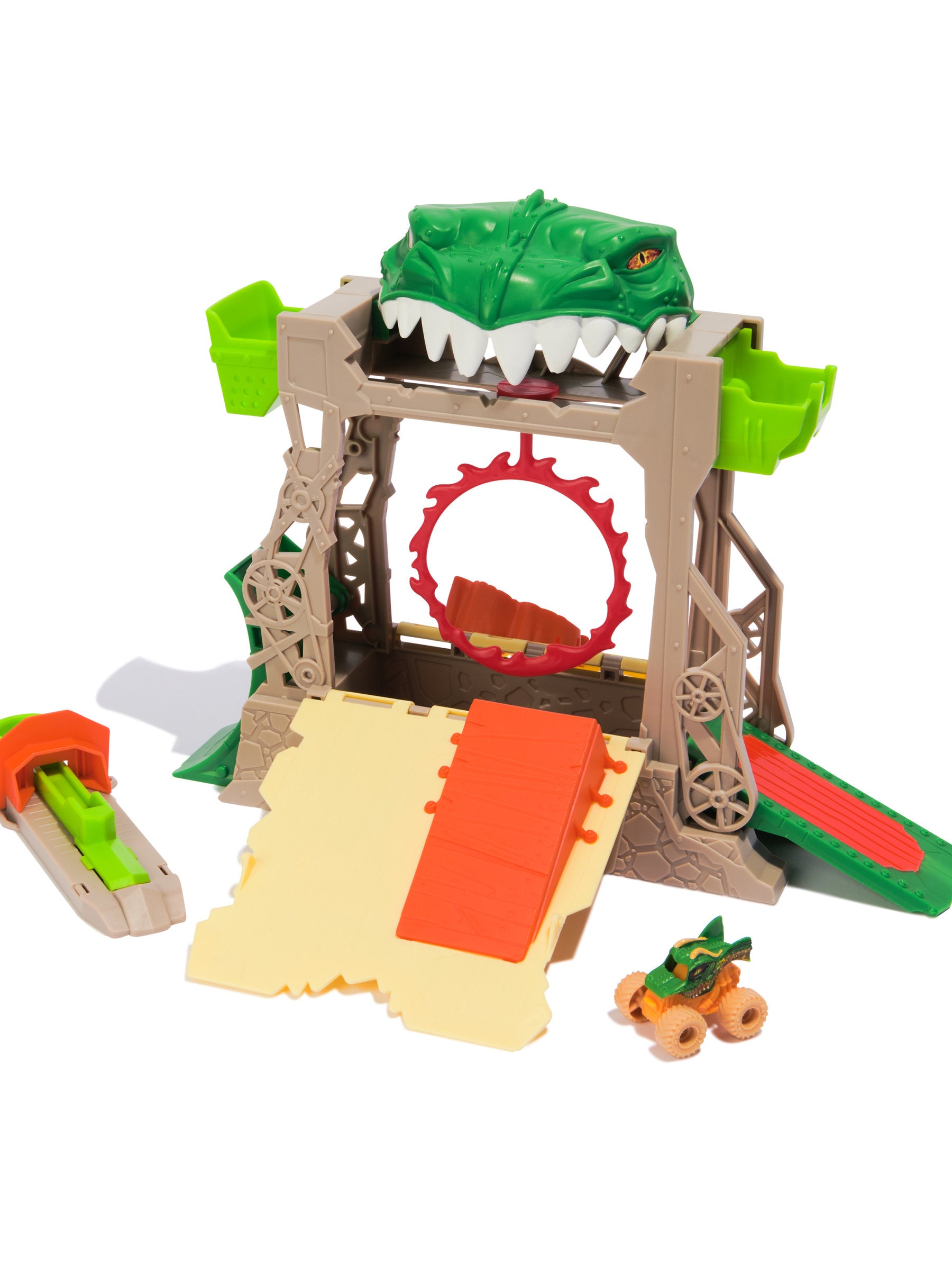 This playset promises endless excitement with features that allow kids to smash, crash, and execute jaw-dropping stunts just like the electrifying spectacles seen at Monster Jam live events. Navigate your Dragon Monster Truck through daring challenges including front flips, back flips, and awe-inspiring high jumps. Can you master the leap through the fiery ring of doom? Each Mini Jam truck, including the exclusive Dragon Monster Truck, boasts intricate details and vibrant graphics, mirroring their full-sized counterparts. When it’s time to hit the road, the Dragon Dungeon of Doom transforms into a portable carrying case. Secure the lid, grab the handle, and store up to 12 mini Monster Jam trucks inside. Perfect for on-the-go fun and easy clean-up!