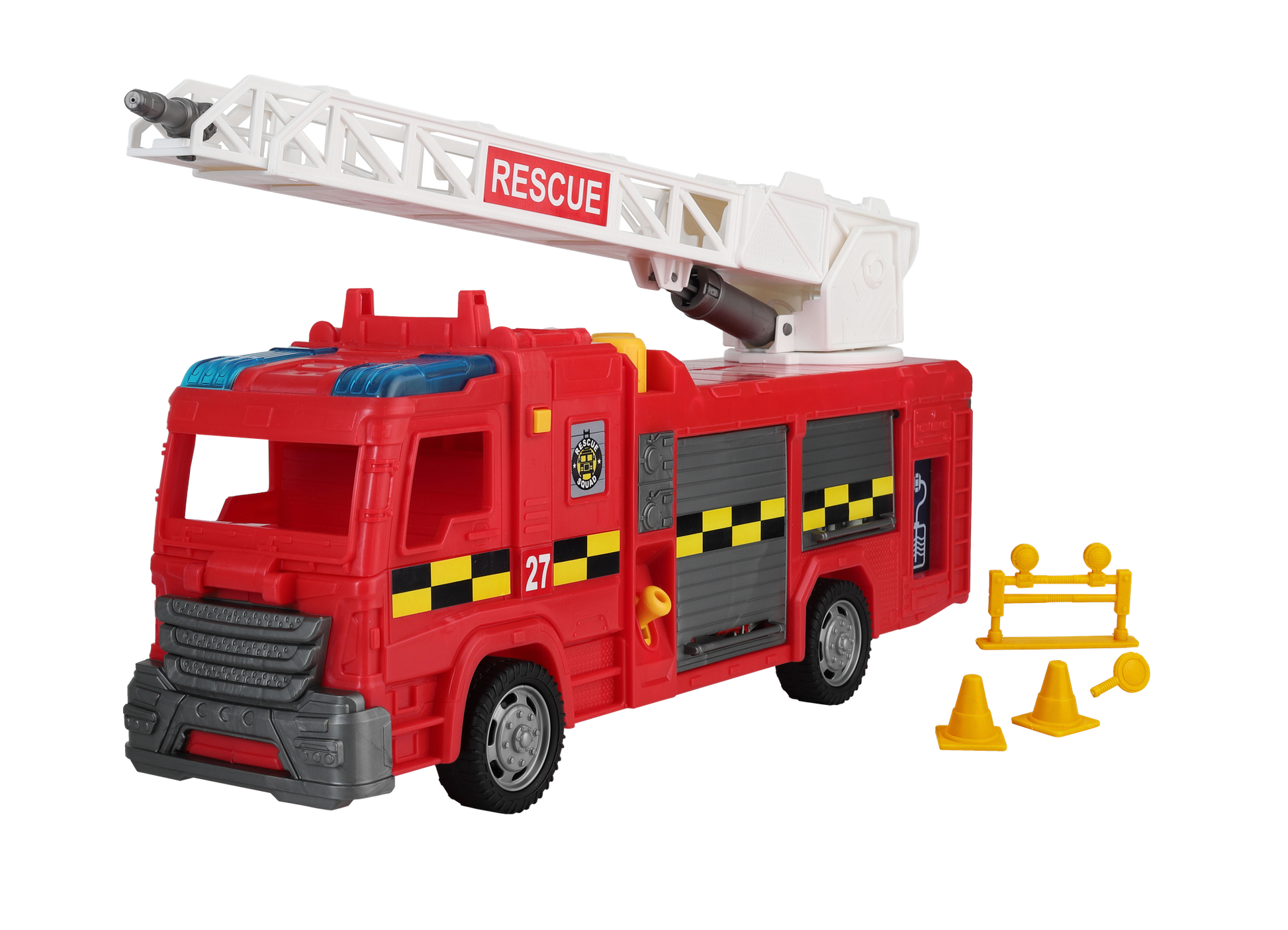 There are also safety cones and roadblock signs that can be stored on top of the truck or in the side compartment. With this fire engine, you're ready for any emergency!