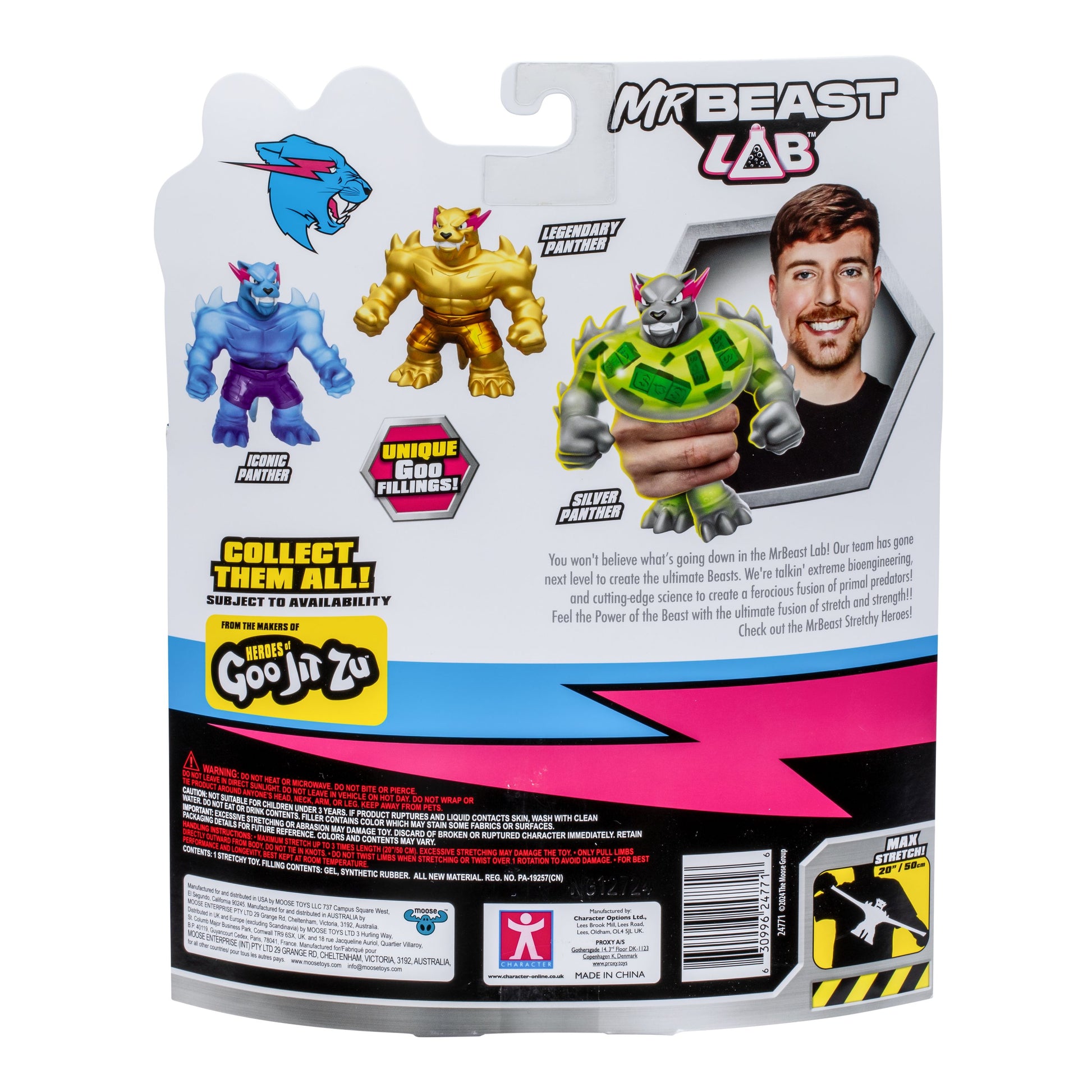 Don’t forget to collect all three unique Stretchy Heroes including: Iconic, Legendary and Silver Panther, each with their own special goo fillings to discover! Let the stretchy, battling adventure begin with the all-new MrBeast Lab Stretchy Heroes!