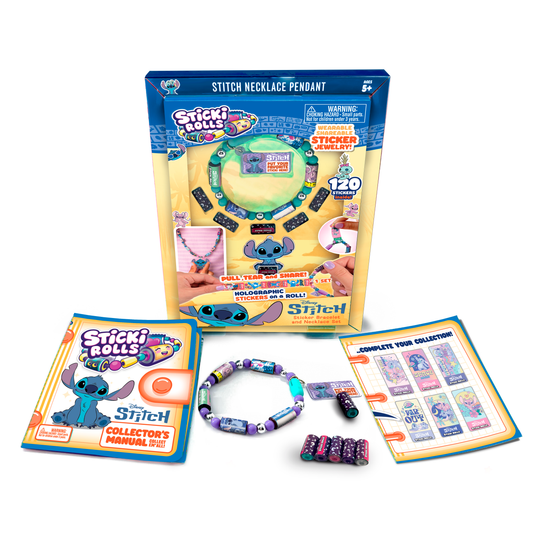 Embark on an adventure with the Sticki Rolls Disney Stitch Sticker Jewellery Making Set! This exclusive set brings Stitch's lovable charm and Hawaiian spirit to life through custom-designed Sticki Rolls. The pack includes a stylish bracelet with a unique Stitch charm tag, a pendant, and 120 limited-edition Sticki Rolls stickers featuring Stitchs fun personality and tropical adventures.