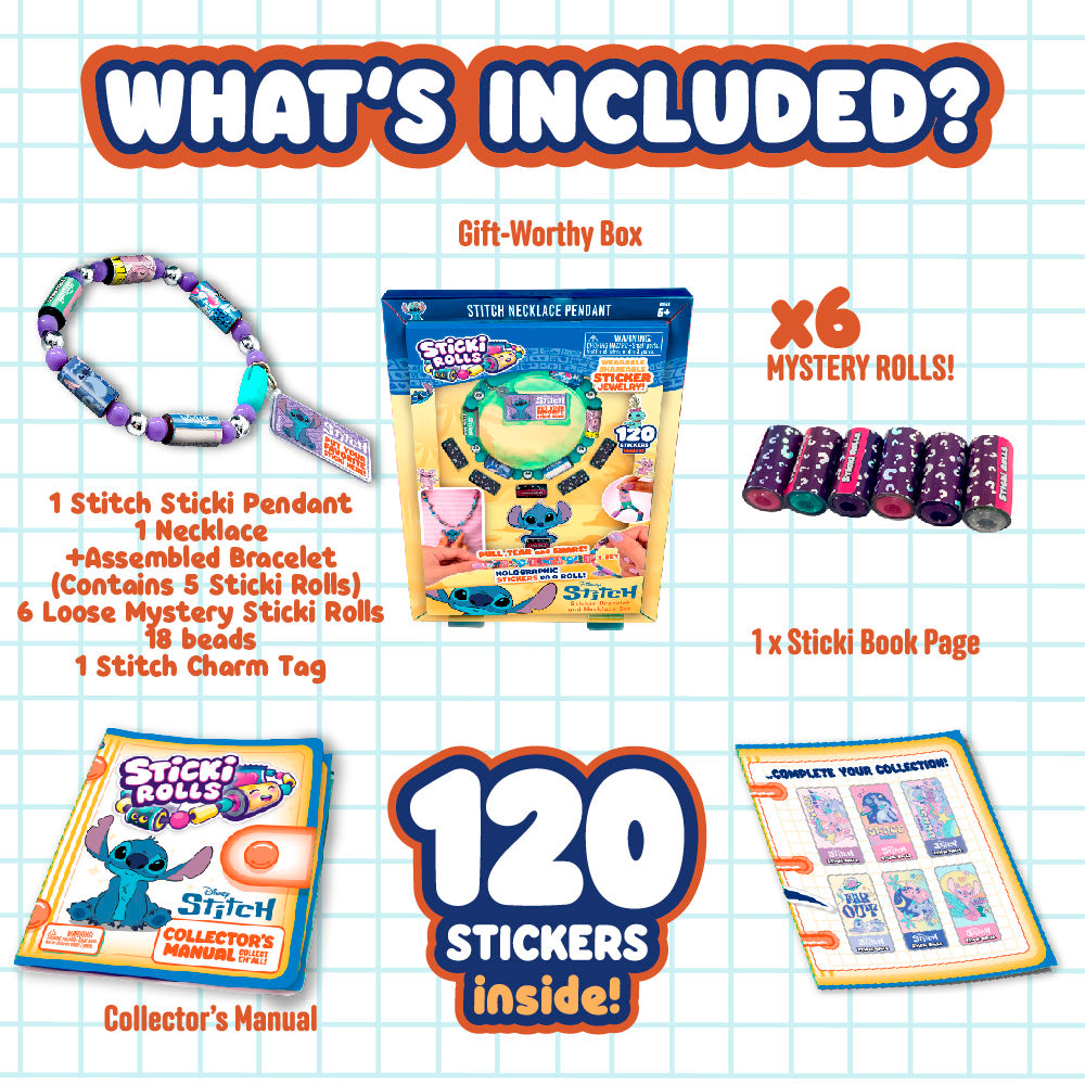 Contents: x1 Assembled Bracelet with Stitch Charm, x1 Stitch pendant, x120 Stitch stickers, x1 collector's manual, x1 Sticki Book page, x6 mystery Sticki rolls Product Dimensions: 16.3cm(W) x 3.1cm(D) x 25.4cm(H) x 0.18kg approx Suitable for ages: 5+ years. WARNING: CHOKING HAZARD - Small parts. Not for children under 3 years.