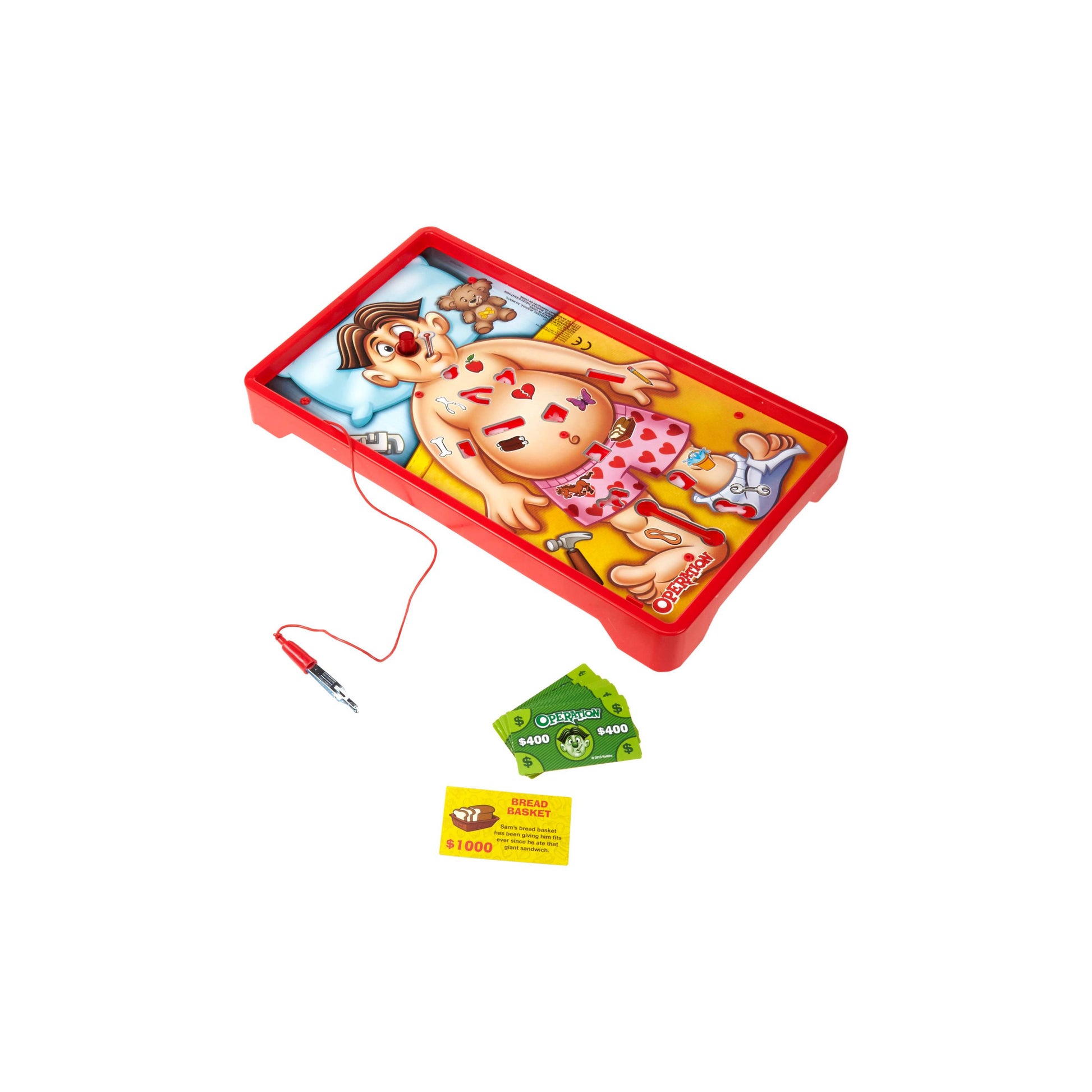 It's the family favorite Operation game with fun Try Me packaging and truly classic funny ailments! Cavity Sam is feeling a bit under the weather, and kids will love to "operate" and make him better. Use the tweezers to take out all of Cavity Sam's 12 funny ailment parts that parents might remember -- such as a wishbone, Charlie horse, and Adam's apple. Players choose a doctor card and "operate" to remove that ailment from Sam, and collect the money if they can avoid the buzz. The player with the most money wins!