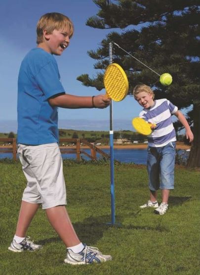 Fast 2 player bat and tethered ball game for the whole family. Orbit Tennis includes "in ground" powder coated base pole and chrome plated top pole. 2 styles of game play. Swivel rotates freely for fast exciting play.