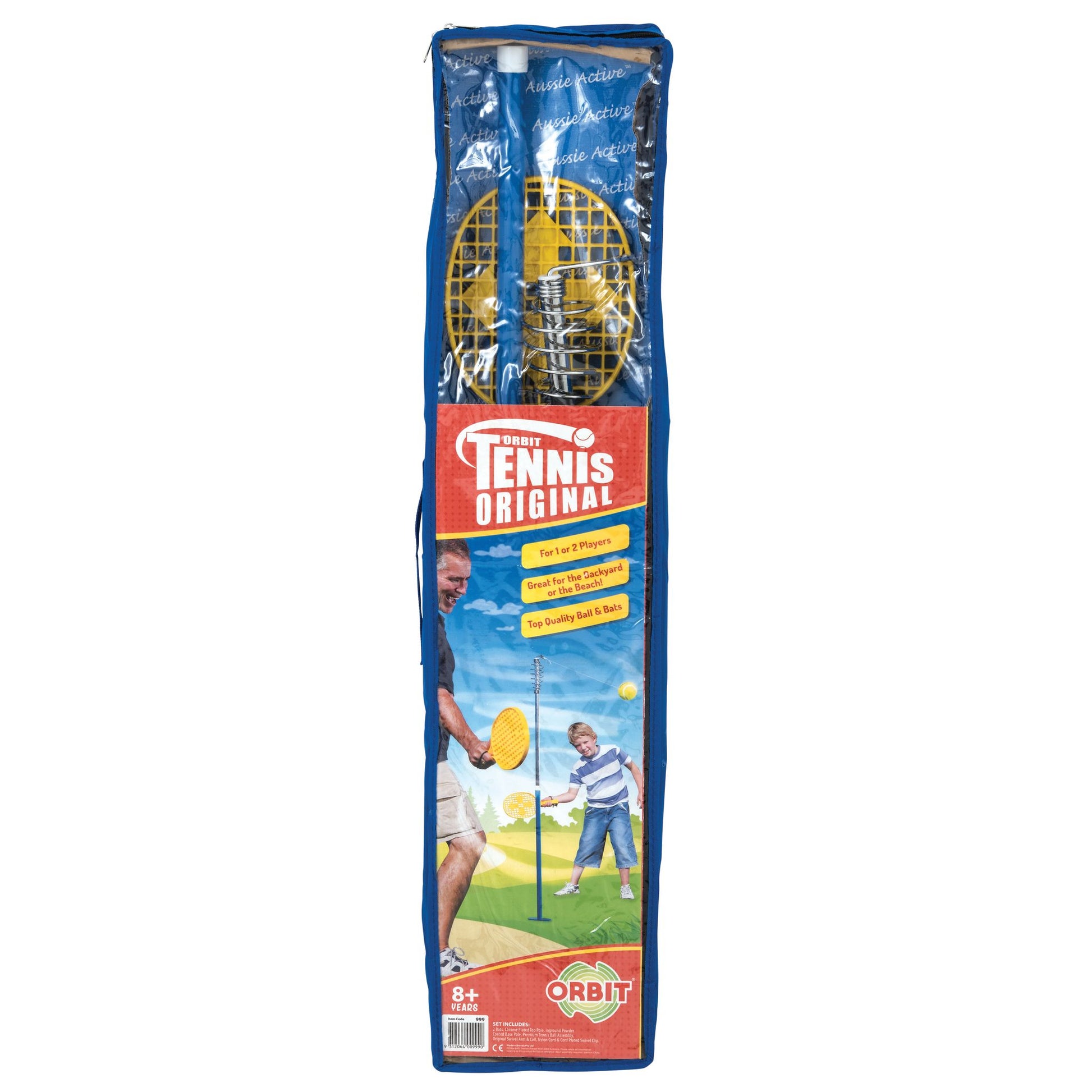 Spring enables scoring and game variation. Complete with 2 strong polypropylene bats with wrist straps and top quality Orbit Tennis Ball with nylon cord and swivel assembly. Supplied in a heavy duty zip-up bag for easy storage.