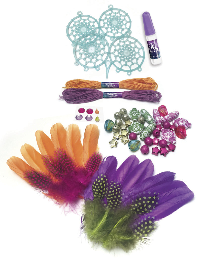 Make 2 owl-shaped dreamcatchers! Their glow in the dark eyes will catch all nightmares while you're asleep! 2 glow in the dark dreamcatcher bases, 2 colors of cotton thread, 28 feathers 28 stylish beads, 6 rhinestone stickers, Jewelry glue NET 0.2 FL OZ (6 ml).Color instructions, Petulias story pamphlet