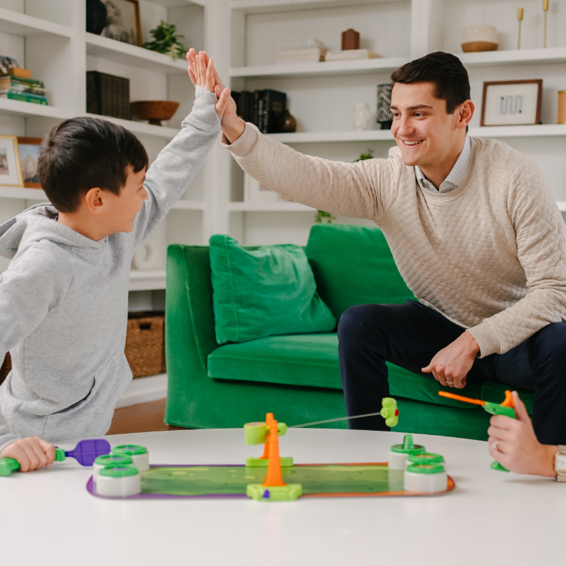 The hottest paddle sport around has been brought from the court to the tabletop with Pickleball Blast - The Pickle Smackdown Game! (for VERY competitive people). It's fast, fun and frantic! Smash the wildly wiggling pickle with your Pickleball Paddle in this fast-paced face-to-face battle. Aim for your opponent’s Pickle Jars, but watch out! The uniquely weighted Pickle Skewer means that every hit can be spiked back at YOU. The first player to flip over two of the three Pickle Lids scores! Pickleball Blast is for 2 people aged 8+.