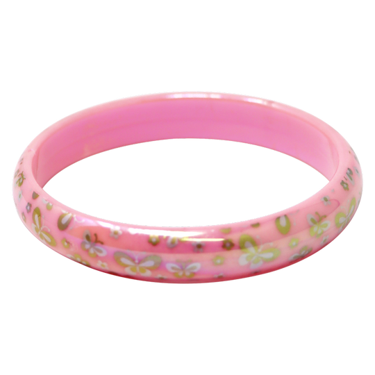 Pink Poppy’s Butterfly Shimmer Bangle. This pink bangle is full of gorgeous butterfly prints and has an iridescent pearlized coating on top, which gives off a lustrous shine from every angle.