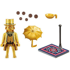 Part of a collectable range, the entertaining Street Performer is gold in colour and holds a golden umbrella. The performer is able to levitate and entertain his audience by holding onto the pole. There is also a pot of coins beside the figure.