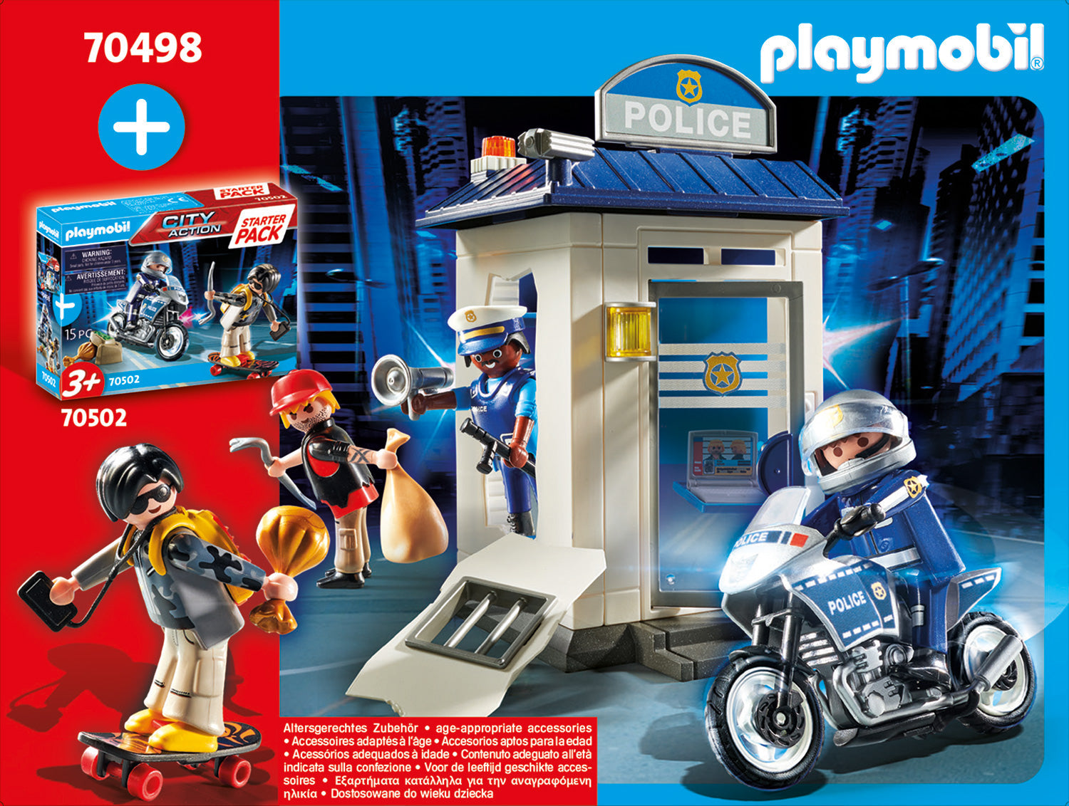 Starter Packs - the perfect introduction to the PLAYMOBIL theme worlds! The smart policeman had just put the thief behind bars and then he breaks out again! He escaped through a hole in the prison wall. But the brave policeman is already on his heels. The chase begins! PLAYMOBIL Starter Packs are the ideal introduction to the big colourful PLAYMOBIL world. The sets consist of a building part, two figures and extras, are quickly assembled and ready to play. Due to age-appropriate accessories, Starter Packs are already suitable for children from three years on.