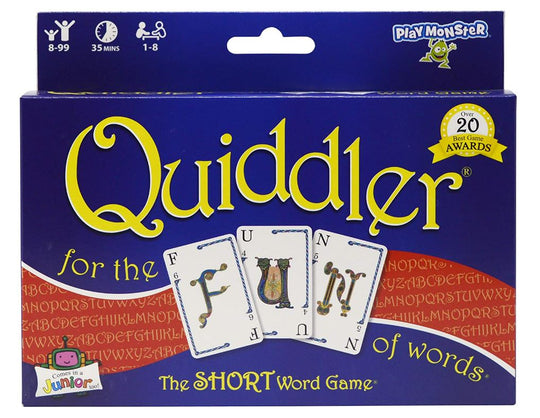 Quiddler is a delightful challenge for rookies and wordsmiths alike. There are two bonuses each round: one for the longest word and one for the most words! The object is to arrange all the cards in your hand into one or more words. There are 8 rounds per game. Start with 3 cards in the first round, 4 cards in the second round, on up to 10 cards in the last round. Players draw and discard until someone forms their entire hand into words using two or more cards per word. Once a player goes out, everyone else gets one last chance to draw and put down the words they have made. Quiddler is called ‘The SHORT Word Game’ because readers of all ages can play and win with short words like ‘at’, ‘is’ and ‘the’. You can even use a dictionary when it’s not your turn. Try to use your high point letters, but don’t get caught with them in your hand!