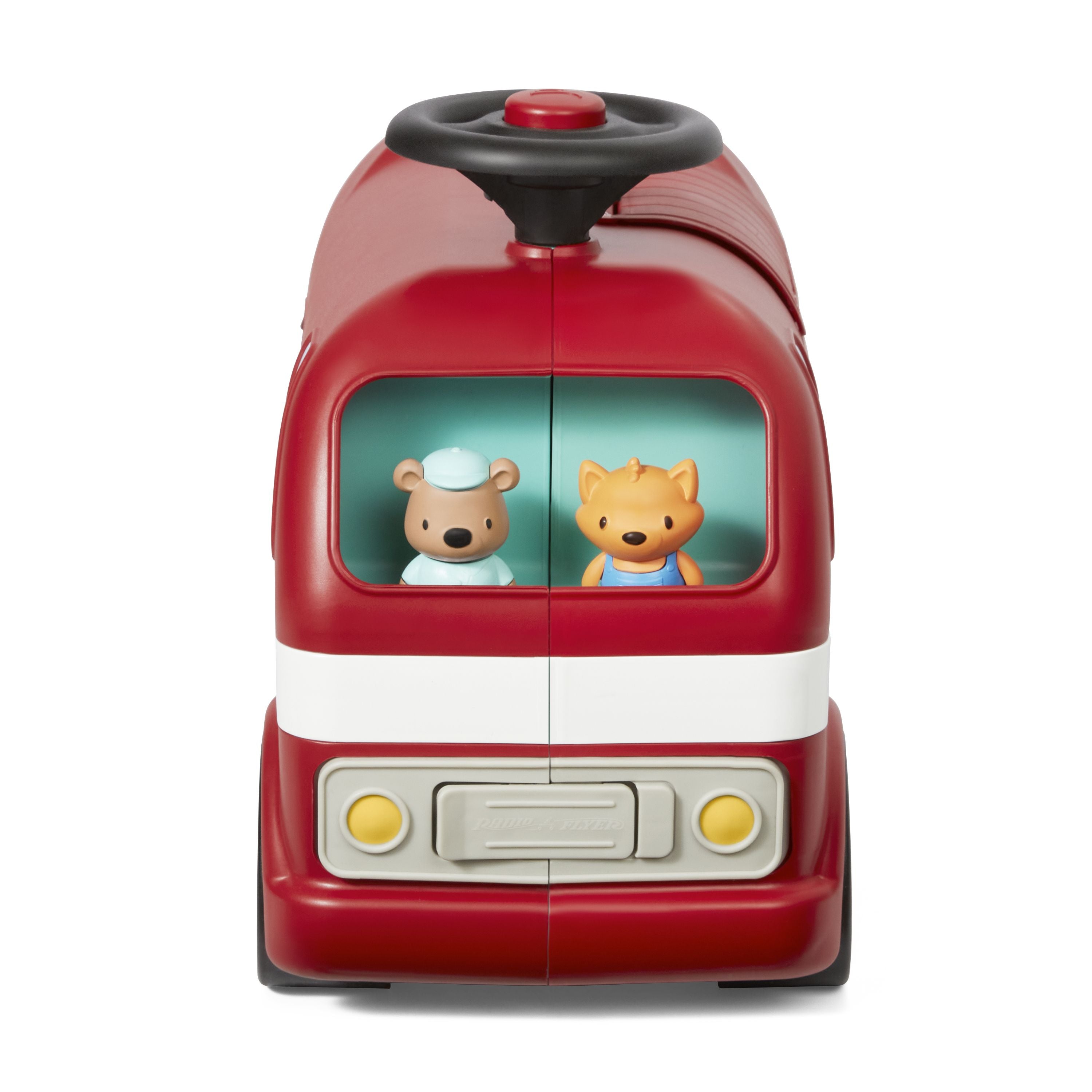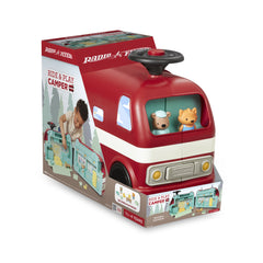 Radio Flyer’s Ride & Play Camper brings camping to life with two fun ways to play. Enjoy scooting around as a ride-on camper, then find a rest stop to transform into a playset for camping fun! Open the ride-on to reveal a playful camper with fixed furniture and décor inside. 8 free-moving toys are included for imaginary play: bear, fox, cooler, table, grill, boat and two chairs. Toys store in the storage compartment on the outside of the camper while the fox and bear figurines ride up front when not in use. This ride-on and playset combo offers an engaging and imaginative play experience for little ones. The working horn on the steering wheel adds to the fun! Maximum weight capacity 43 lbs.