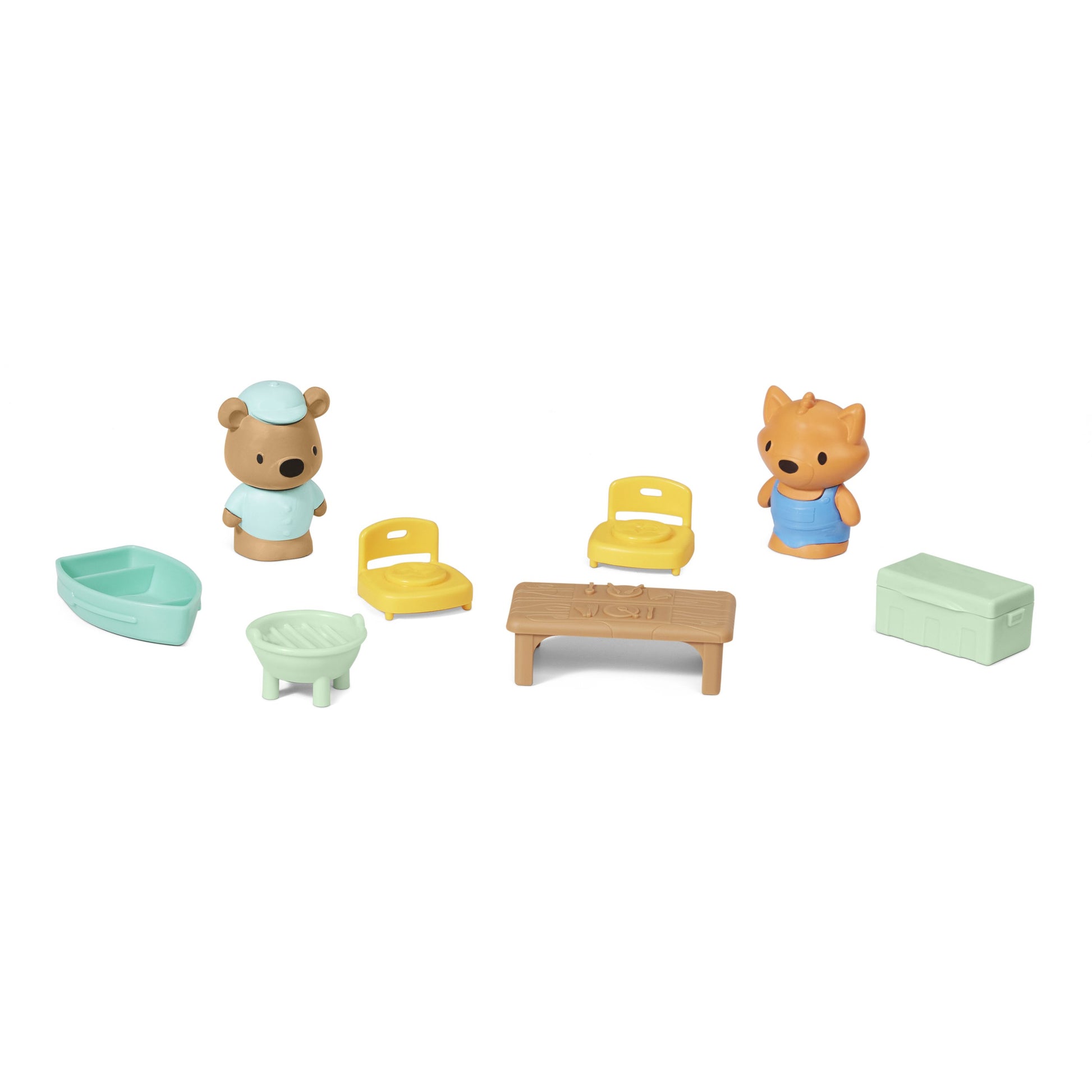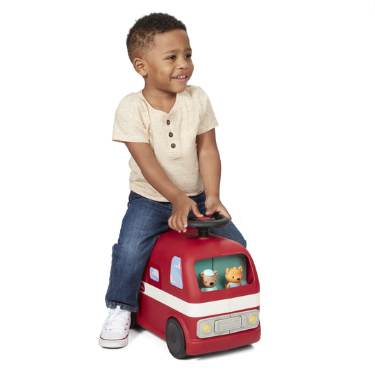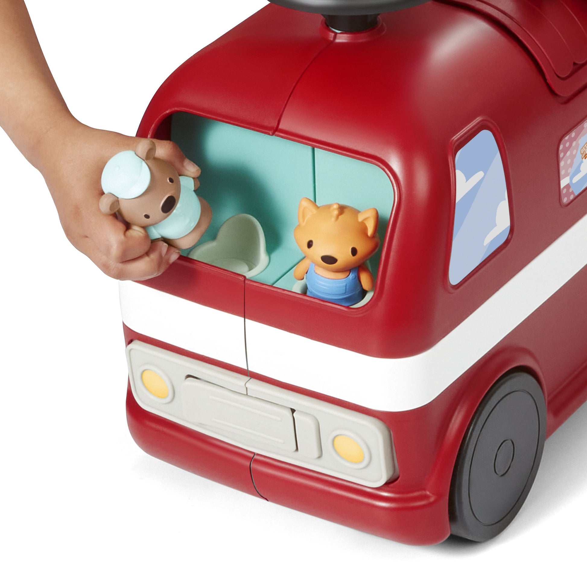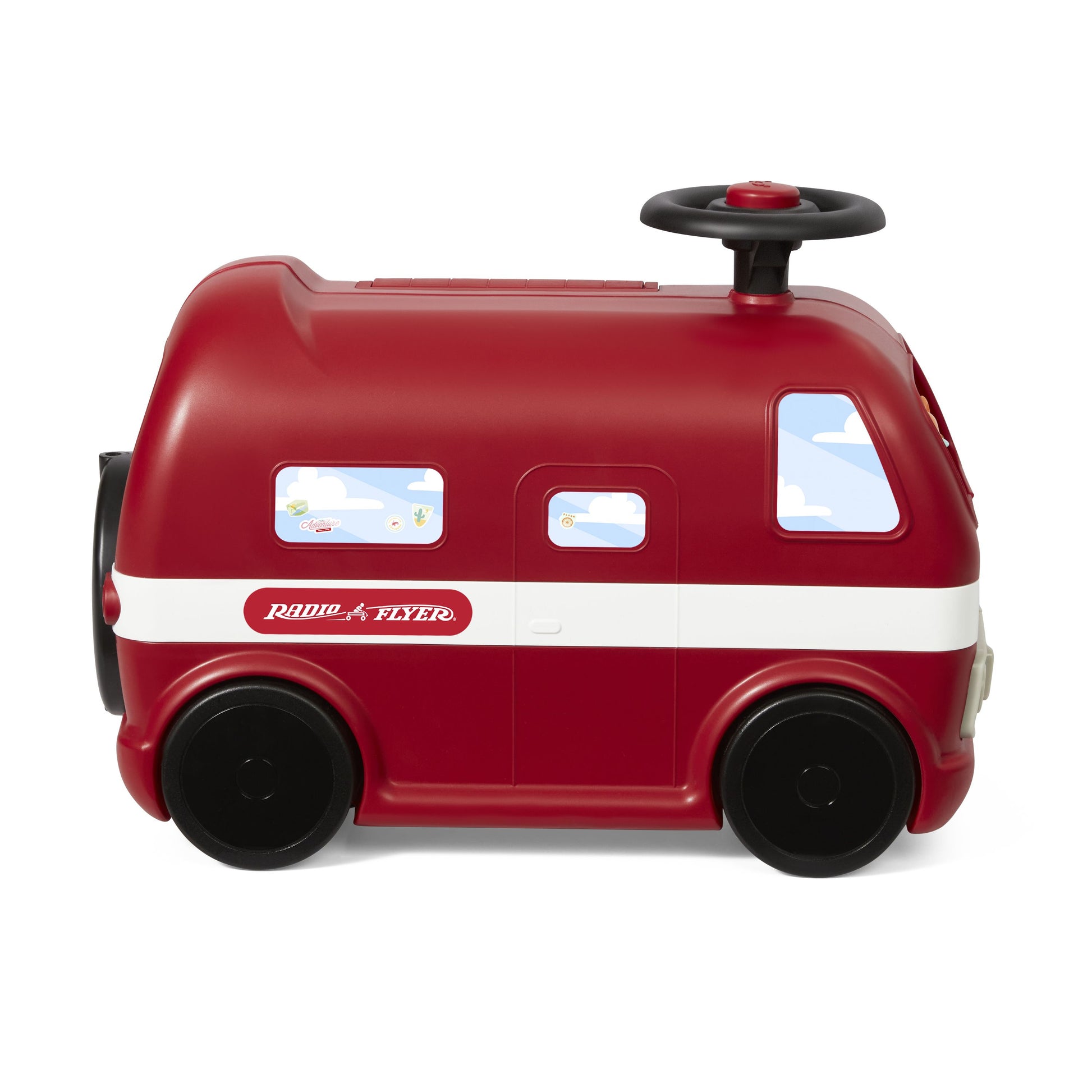 Radio Flyer’s Ride & Play Camper brings camping to life with two fun ways to play. Enjoy scooting around as a ride-on camper, then find a rest stop to transform into a playset for camping fun! Open the ride-on to reveal a playful camper with fixed furniture and décor inside. 8 free-moving toys are included for imaginary play: bear, fox, cooler, table, grill, boat and two chairs. Toys store in the storage compartment on the outside of the camper while the fox and bear figurines ride up front when not in use. This ride-on and playset combo offers an engaging and imaginative play experience for little ones. The working horn on the steering wheel adds to the fun! Maximum weight capacity 43 lbs.