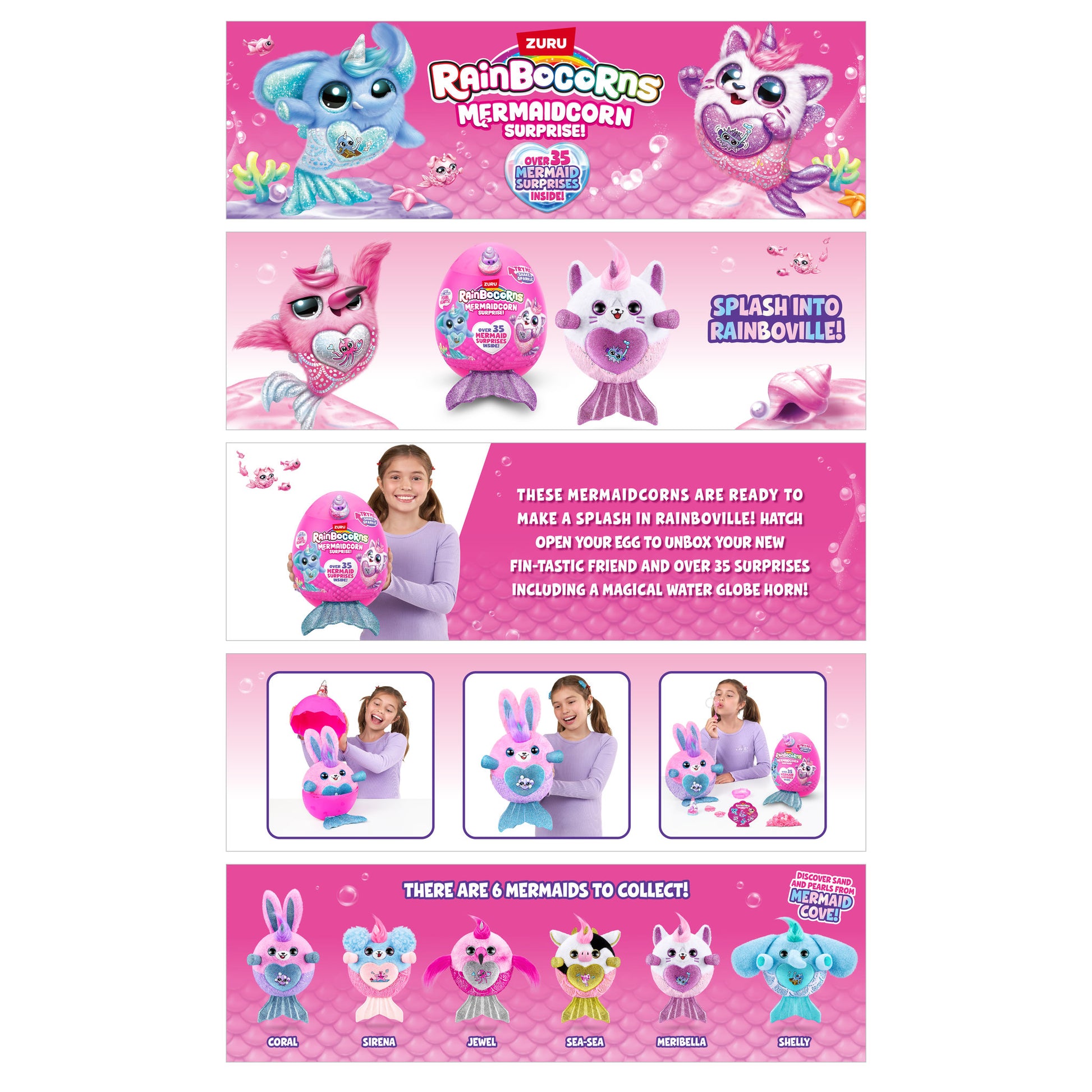 These Mermaidcorns are ready to make a splash in Rainboville! Hatch open your egg to unbox your new fin-tastic friend and over 35 surprises! These cuddly plush come with a shiny mermaid tail and a boo-boocorn hidden inside a their water globe horn!