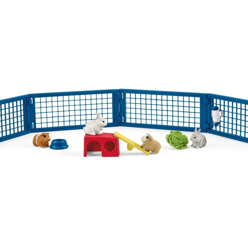 2x guinea pig, 2x rabbit, 1x hutch, 1x seesaw, 1x bowl, 1x water bottle, 1x salad, 5x fence.