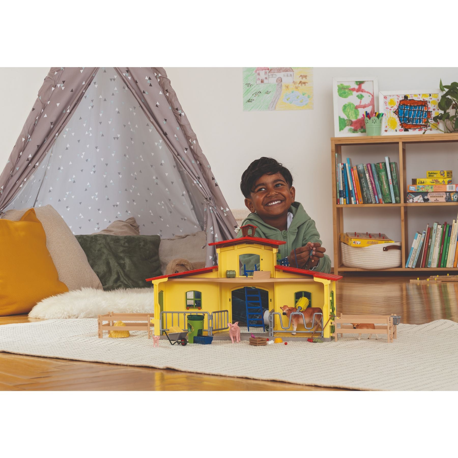 Schleich’s Large Farm is a great set to play with your farmyard friends. You can tend to the model farm animals and ensure everyone gets fed and cared for. This set includes a barn facade with doors and windows that open, fencing, winch, rotating feed carousel, ladder, wheel barrow and farm tools, heaps of accessories, and animals including cat, bird, mouse, pig and piglet, and a cow and calf. You also get a male farmer figurine with articulated limbs ready to run the farm. This awesome playset can also be expanded with the Schleich Pony Box with Iceland Pony Stallion playset SC42609 (sold separately).