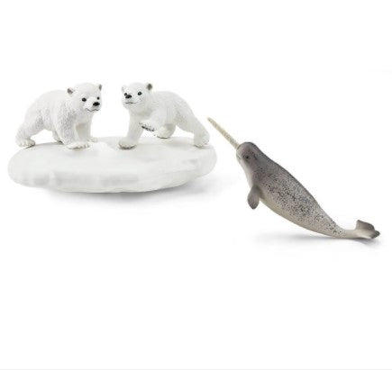 1x Polar Bear cub, 1x Polar Bear cub, playing, 1x Narwal, 1x Ice floe