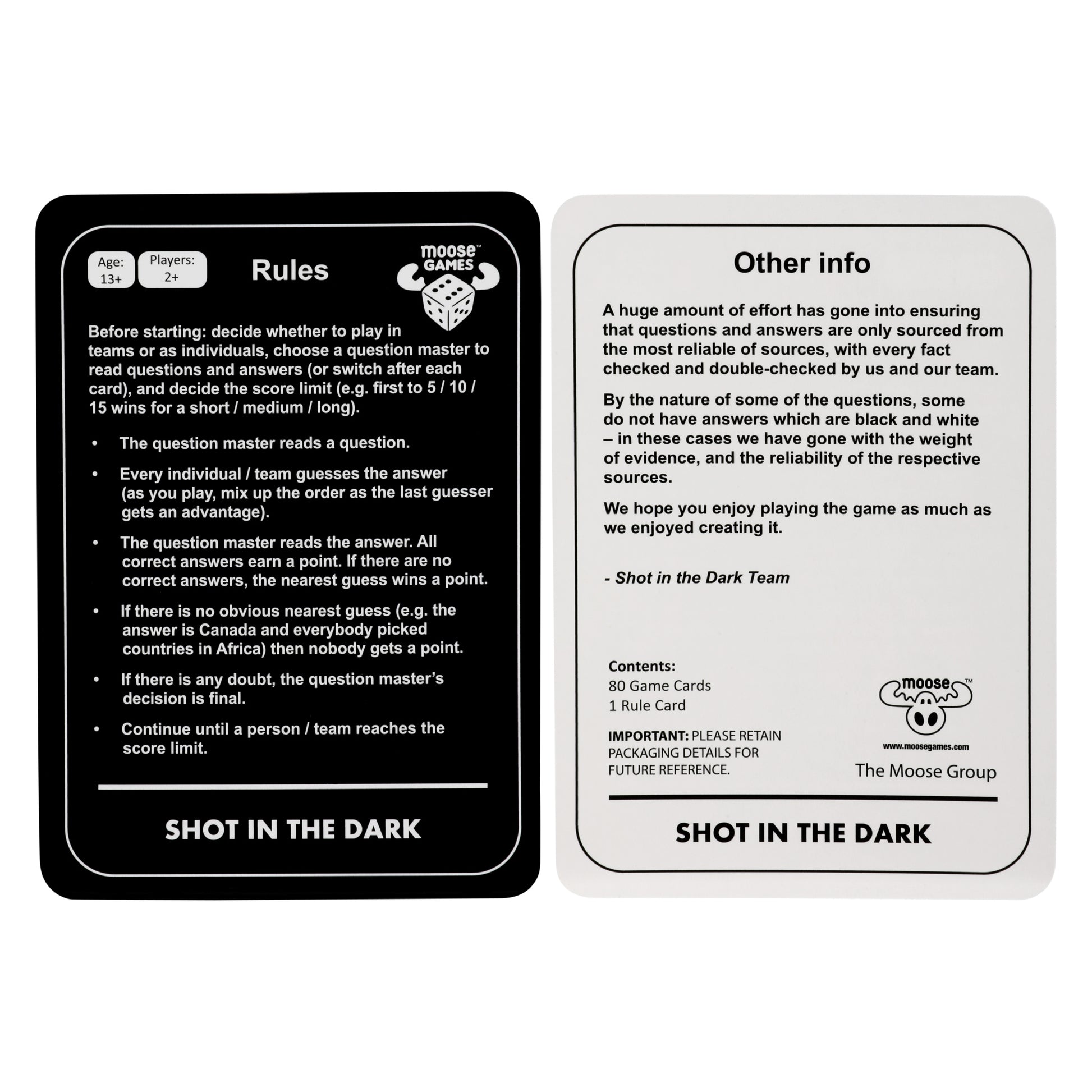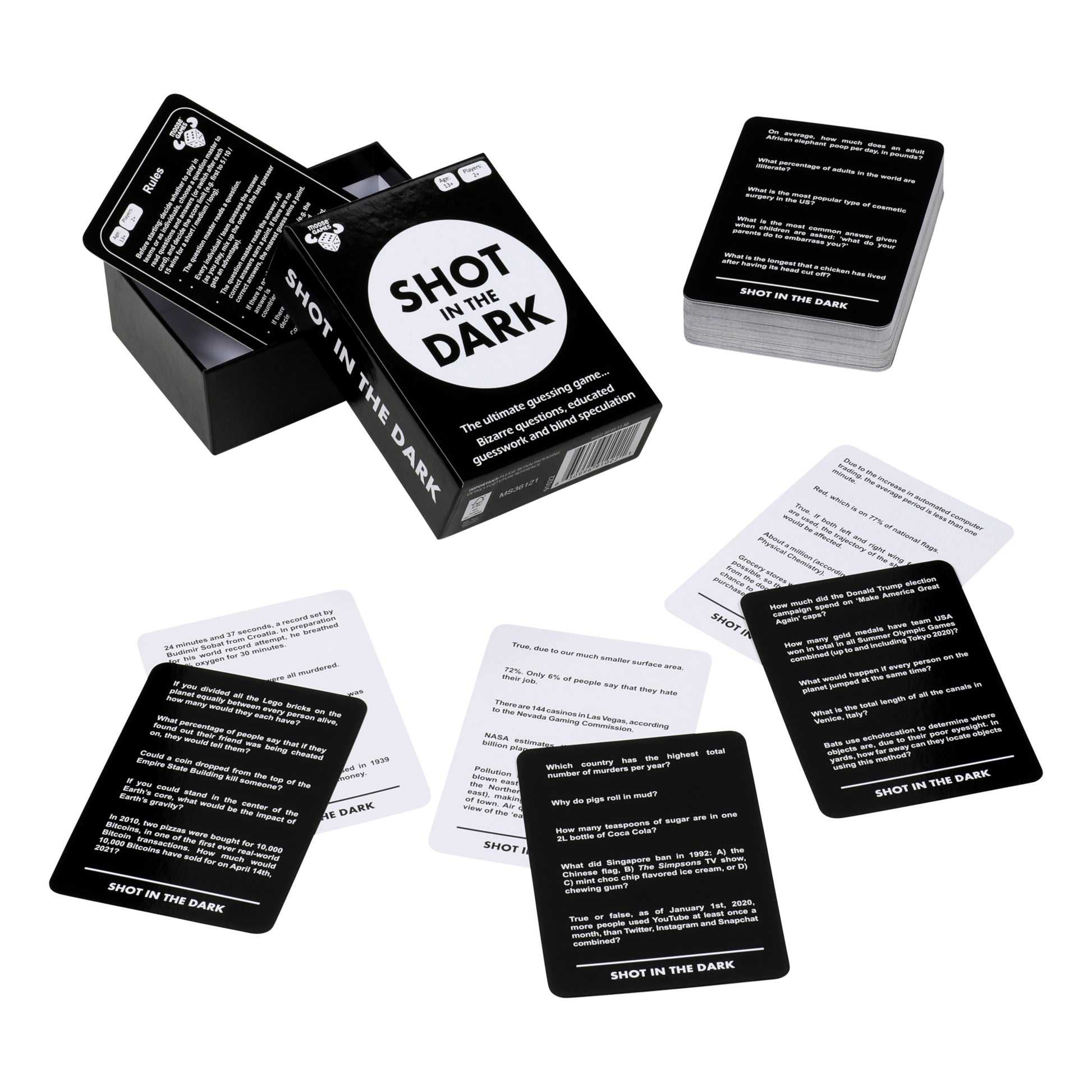 Shot in the Dark is a great game to play with friends or family. No boring quiz questions about capital cities or the Beatles first number one. Instead, Shot in the Dark is a fun party trivia game with hundreds of the most bizarre, interesting and hilarious questions to which nobody knows the answer.