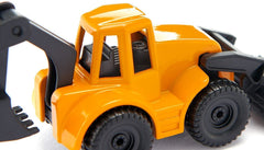 Backhoe loaders are the multi-talent machines on the construction site. Two construction machines in one: at the front a wheeled loader with a large shovel, and at the back an excavator with a small shovel. And so a lot of material can be cleared away. The front loader and the excavator/shovel can be moved up and down.