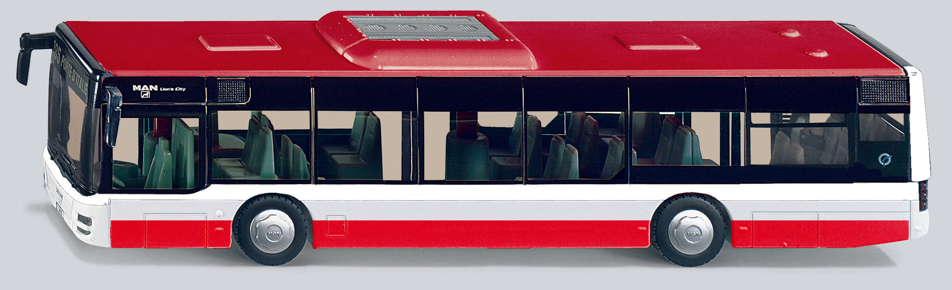 Very detailed bus model to original design of MAN Lions City to 1:50 scale. Wheels with rubber track. 2 axles, second axle with twin tyres. The 2 right-hand doors open. Engine bonnet opens at rear. Tinted windows. Separate rear mirror and integrated radiator grill. Plastic front and rear lights. Roof with air-conditioning.