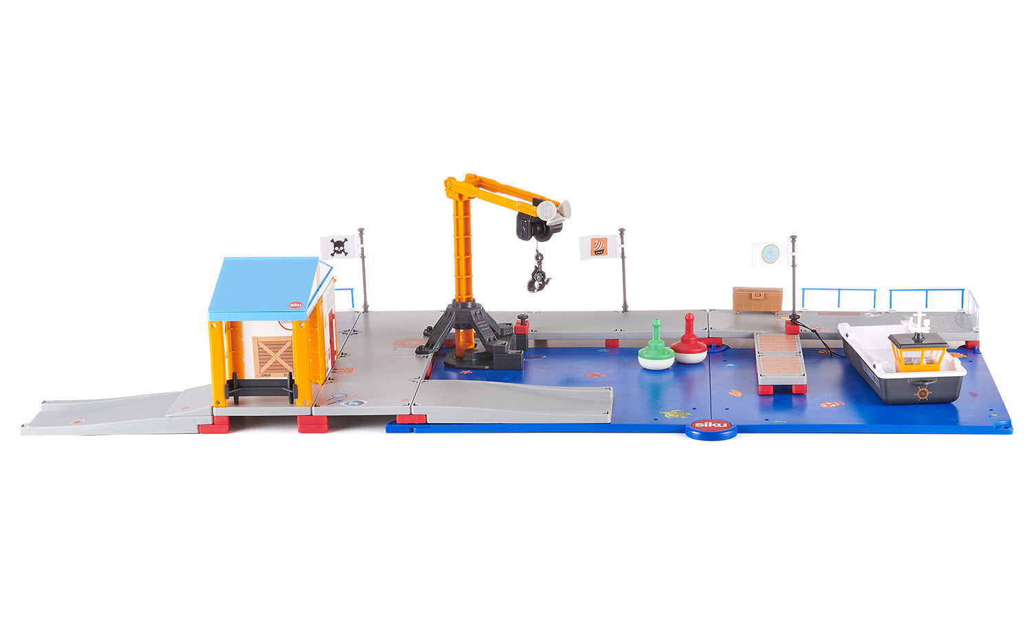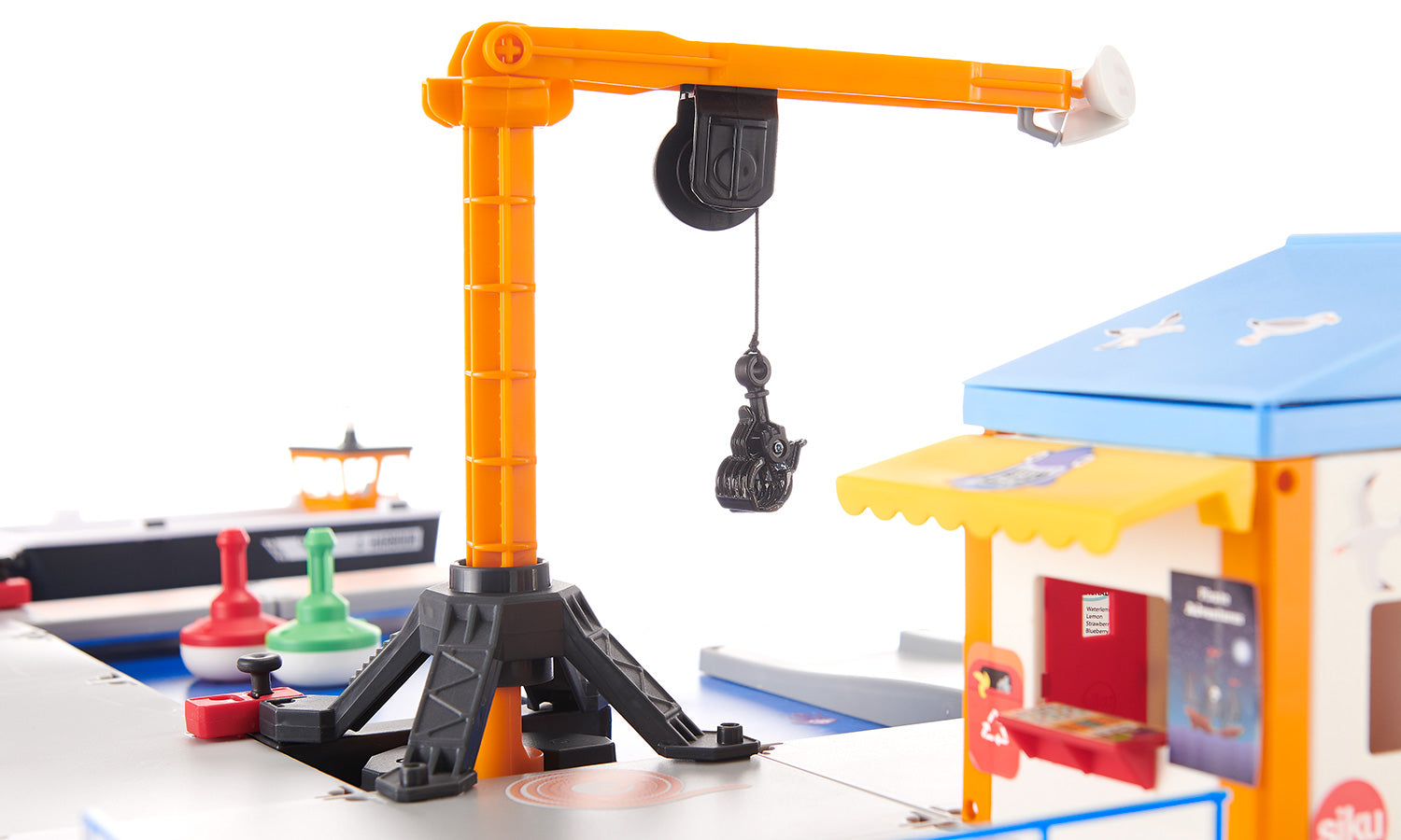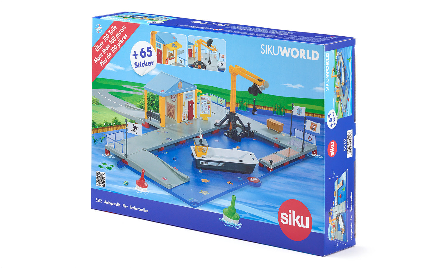 Siku Word pier with adjustable pontoons, access ramps, adjustable and rotating crane for unloading freight, harbour boat, building with customs zone and snack bar and shop. Customising sticker sheet included. Compatible with other Siku World products.