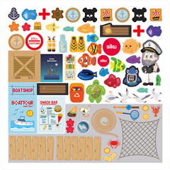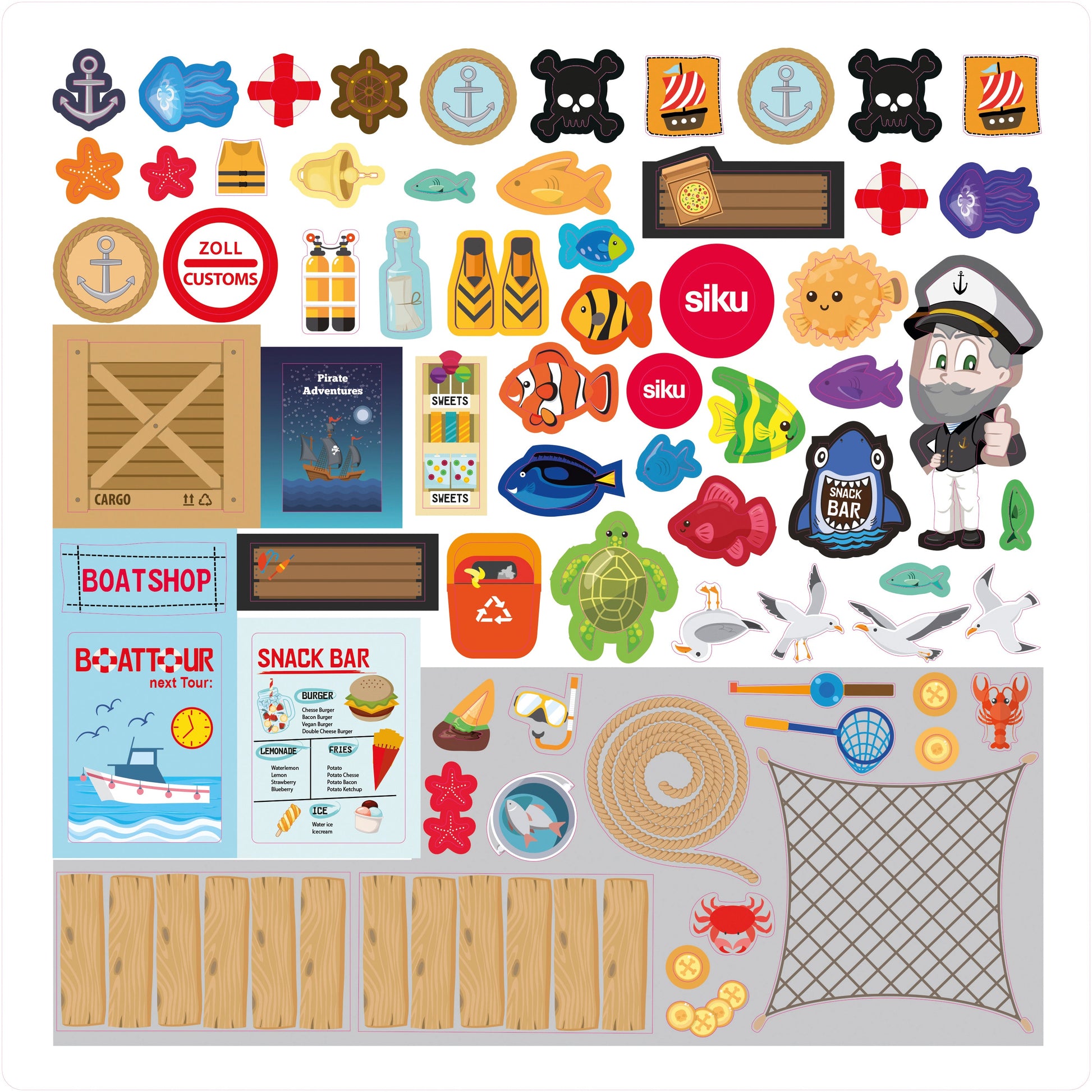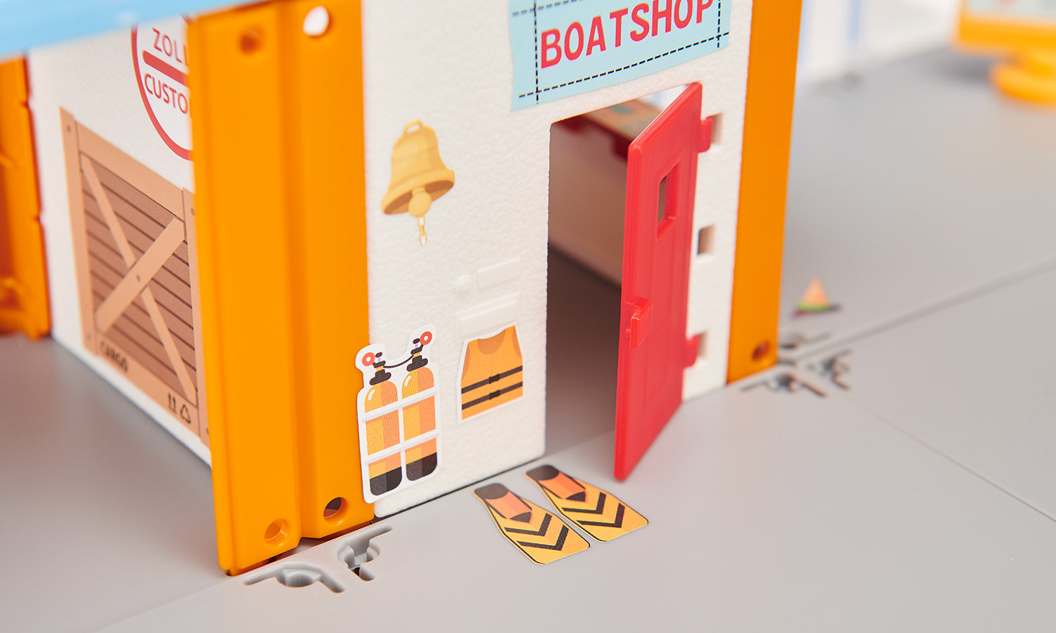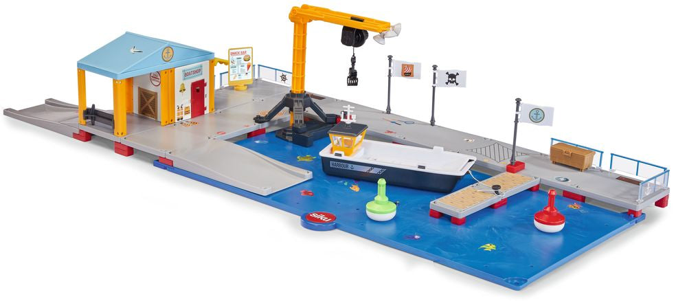 Siku Word pier with adjustable pontoons, access ramps, adjustable and rotating crane for unloading freight, harbour boat, building with customs zone and snack bar and shop. Customising sticker sheet included. Compatible with other Siku World products.