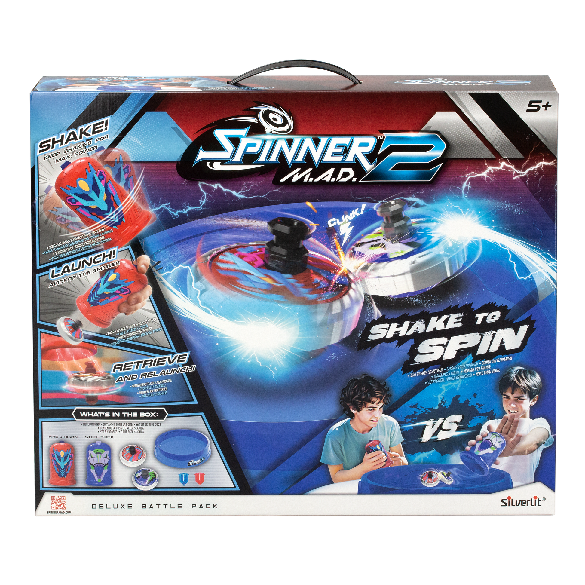 Key Features: • Shake to Spin! • Retrieve and Relaunch during the battle • Super powerful spinner! • Exclusive Battle Pack Shakers and Spinners style. • Metal body with real powerful clashing sound effects • Battle Arena specially designed for Spinner M.A.D. 2 battle • *5 types of performance tips o Passive attack o Everlasting o Impulsive attack o Dynamic attack o Close combat *1 Random type assigned to each spinner • Vroom! keep shaking for max. power! • Pow! launch the spinner like a rocket! • Clink! when 2 spinners collide