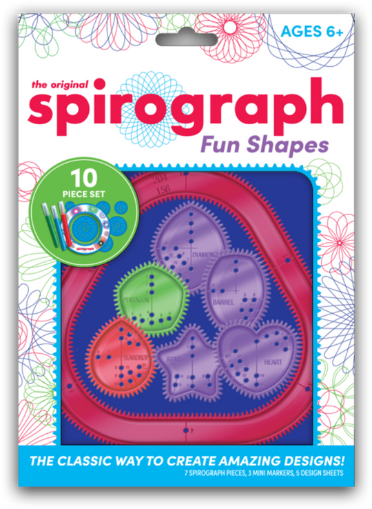 The classic way to make fun-shaped spiral designs! Perfect for artists of all ages and great for on-the-go! The Spirograph Fun Shapes Envelope set contains: 7 Spirograph pieces, 2 Mini-markers, 5 Design Sheets.