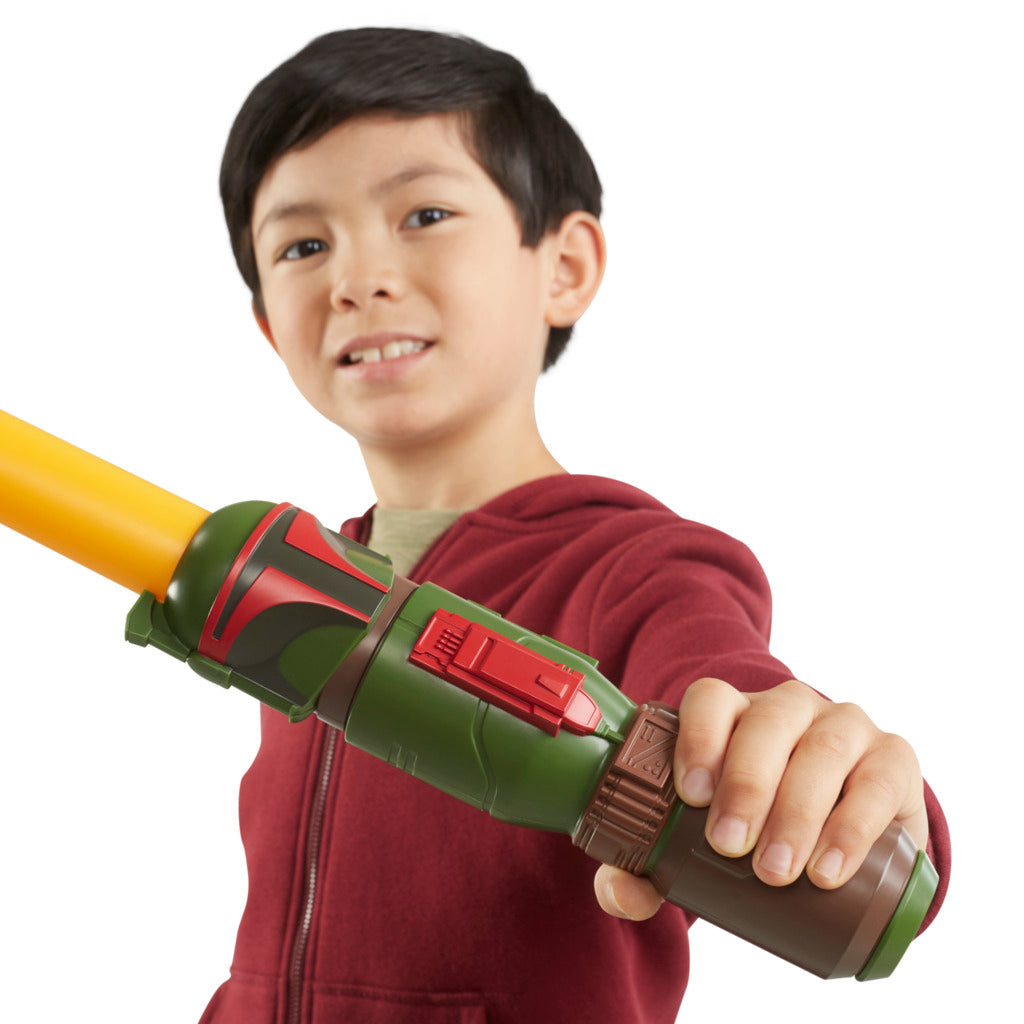 FLICK TO EXTEND: Kids ages 4 and up can extend the Star Wars Lightsaber Squad Boba Fett yellow Lightsaber blade for imaginary battles with a flick of their wrist