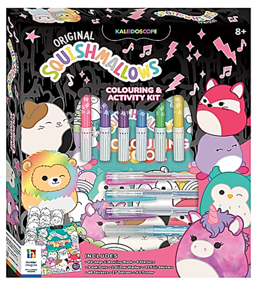 Join the cute and cuddly Original Squishmallows on an amazing colourful adventure! This kit contains heaps of fun thingsincluding a 64-page colouring book, six bold double-ended markers, a sparkly glitter marker as well as heaps of stickers, atattoo sheet and an A3 coloured poster of the Squishmallows squad having a blast!Kit Contains -• 6 double-ended markers• 2 coloured sticker sheets• 1 holographic stickersheet• 3 gel pens• 1 sparkly glitter marker• Tattoo sheet• A3 poster• 64-page colouring book