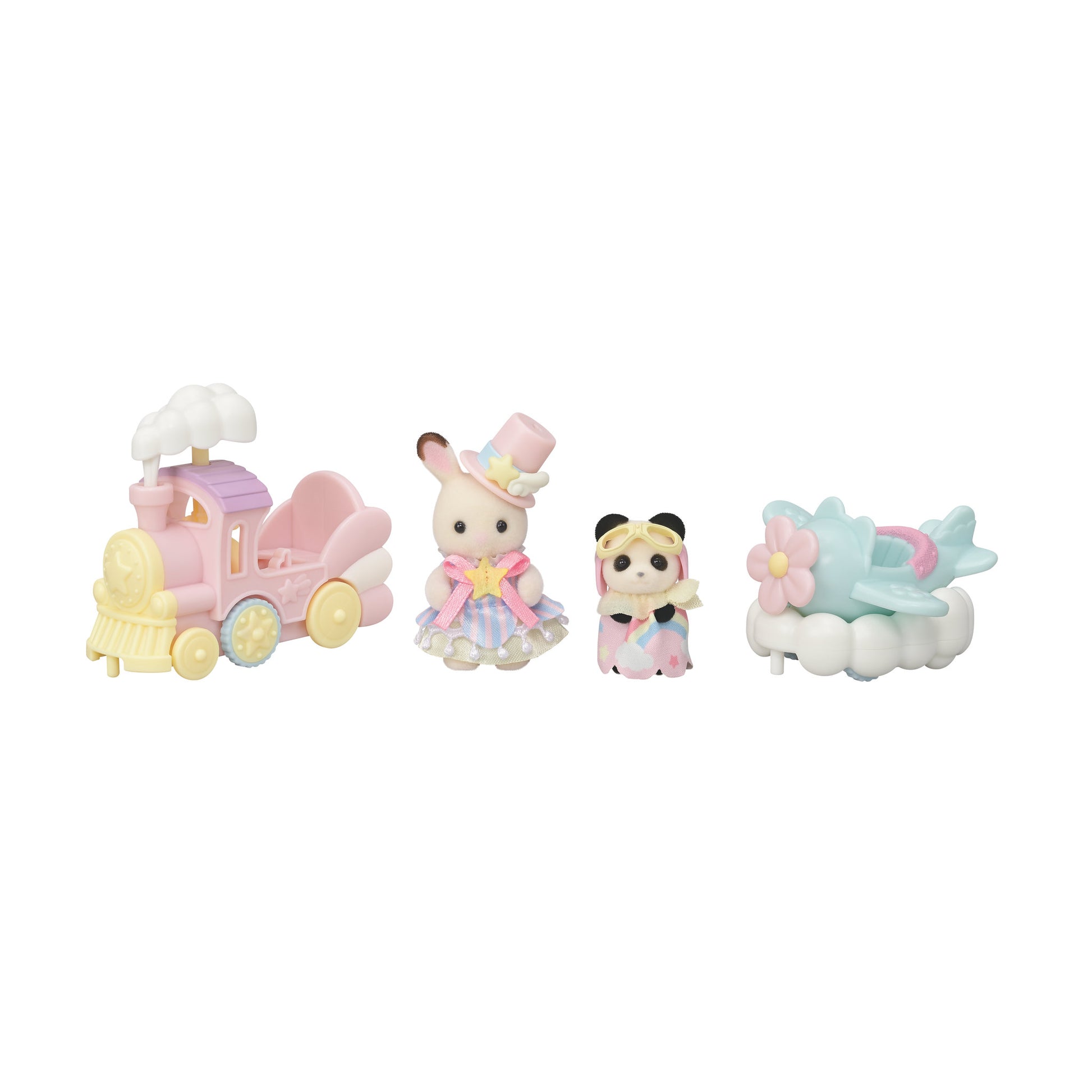 This set includes an adorable ride with fun features, a baby Chocolate Rabbit, and a baby Panda. When the train moves, the smoke goes up and down, and the airplane rocks from side to side. The train and airplane can be connected for added fun. You can also connect this set with the separately sold "Cloud Parade Train Set", "Dreamy Airship in the Sky", "Moonlight Parade in the Sky", and the "Amusement Park Ride Set - Boat & Dolphin" for even more enjoyment.