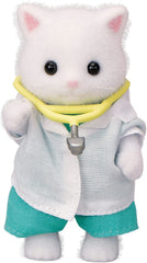 The Village Doctor Starter Set featuring everything you need to pretend playing doctor, including figure with white coat, check-up machine and other medical tools. Help keep healthy with the included syringes, stethoscope, bed, wheelchair, medicine and other accessories. The doctor's bag can be used to store the syringes, stethoscope and medicine. The plaster cast can git onto child figures. Includes Persian Cat mother, Doctor Dawn.