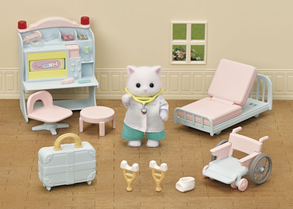 Set includes: Persian Cat mother (Doctor's Outfit), Examination Table, Sign Board, Doctor's Chair, Patient's Chair, Bed, Wheelchair, Doctor's Bag, Stethoscope, Syringe (Large), Syringe (Small), Thermometer, Tablet, Capsule, Cough Syrup, Plaster Cast, Crutches x2, Cold Compress