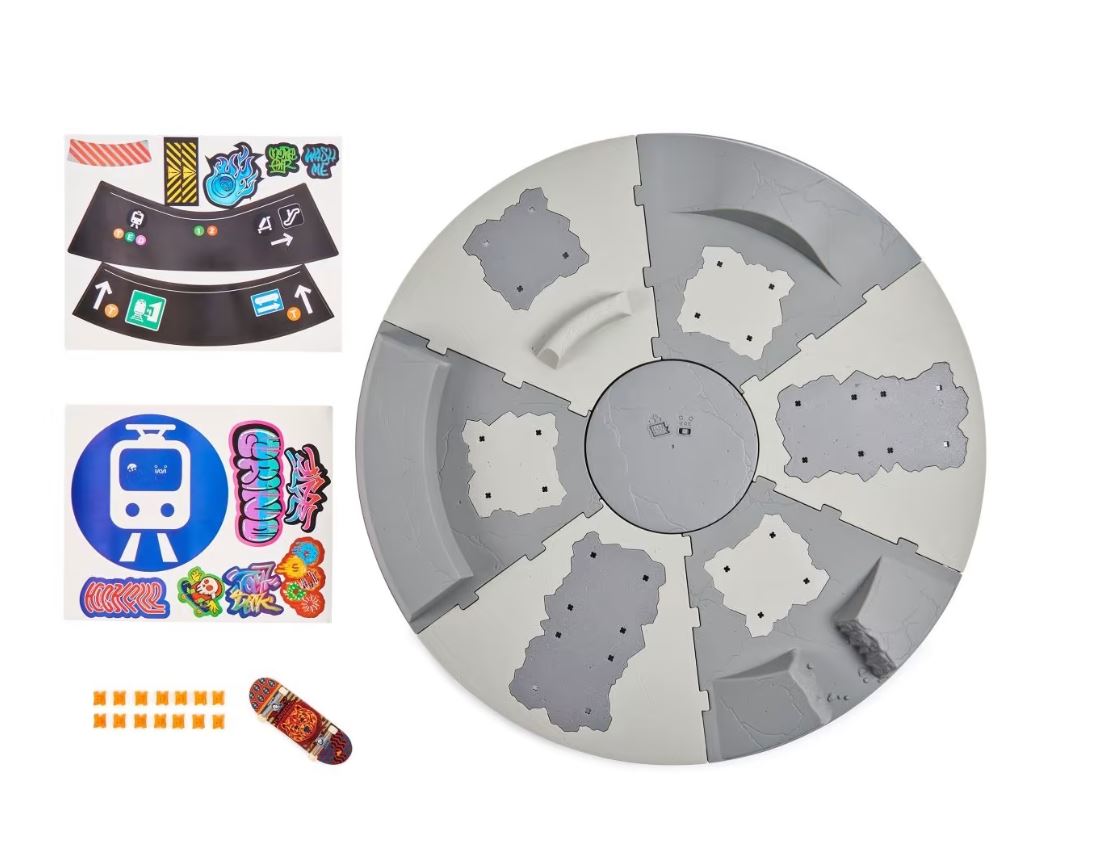 • Includes: 1 Tech Deck, 6 Obstacle Plates, 6 X-Connector Plates, 1 Spinning Motor, 2 Sticker Sheets, 15 X-Connectors, 6 Wheels, 1 Instruction Sheet