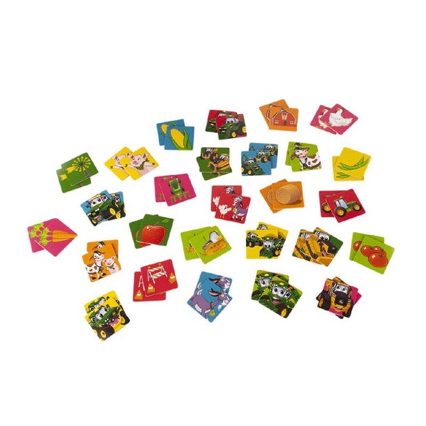 How's your memory? The John Deere Match Game features kid-friendly characters like Johnny Tractor and other familiar sights from the farm. Combines, bull dozers, happy animals and more, they're all ready for a bumper crop of fun! The thick and sturdy pieces are perfect for flipping over and then back again. This classic memory game is a great way to include kids 3 and up in game nights. And with a total of 54 cards, there are 27 matches to be made, for a fun challenge for the whole family.