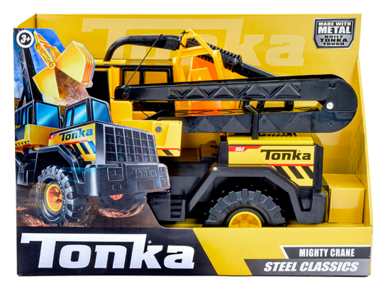 The Tonka Steel Classic Mighty Crane! Built Tonka Tough - Made with real STEEL, this sturdy Tonka vehicle rotates 360 degrees, lifts and carries - just like a real crane.