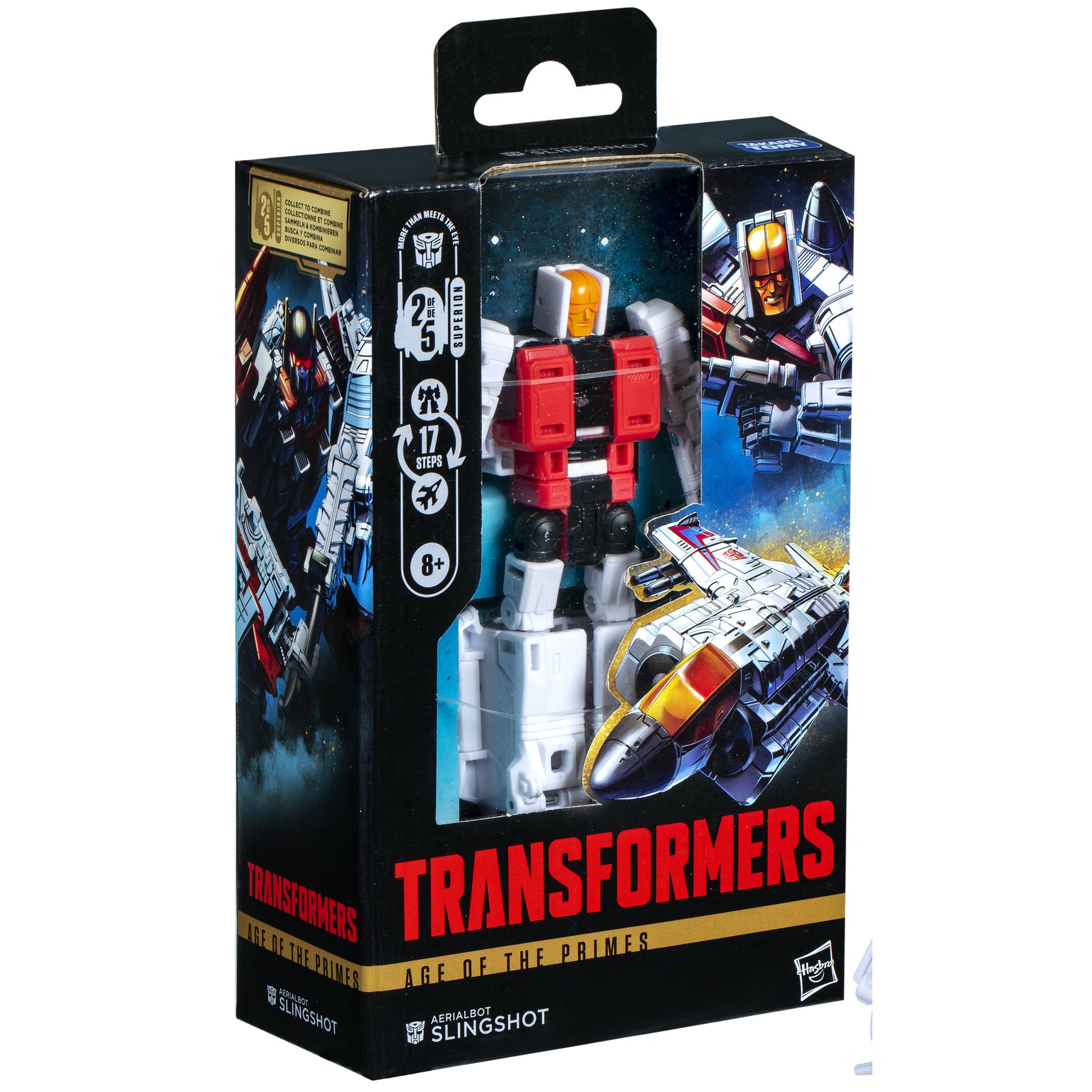 This converts between robot and jet modes in 5.5-inch Aerialbot Slingshot action figure 17 steps. Combine the Slingshot figure with other Transformers Aerialbot action figures to create Superion action figure! (Each sold separately, subject to availability.) The Aerialbot Slingshot figure is inspired by the character from the Transformers universe and features articulated head, arms, and legs for awesome action poses. Transformers: Age of the Primes opens up the world of the Primes, the very first bots in Transformers mythology, a pantheon of Thirteen beings, each with a unique ability and personality. Every battle, every bot, and every power in the Transformers universe can be traced back to one of The Thirteen.