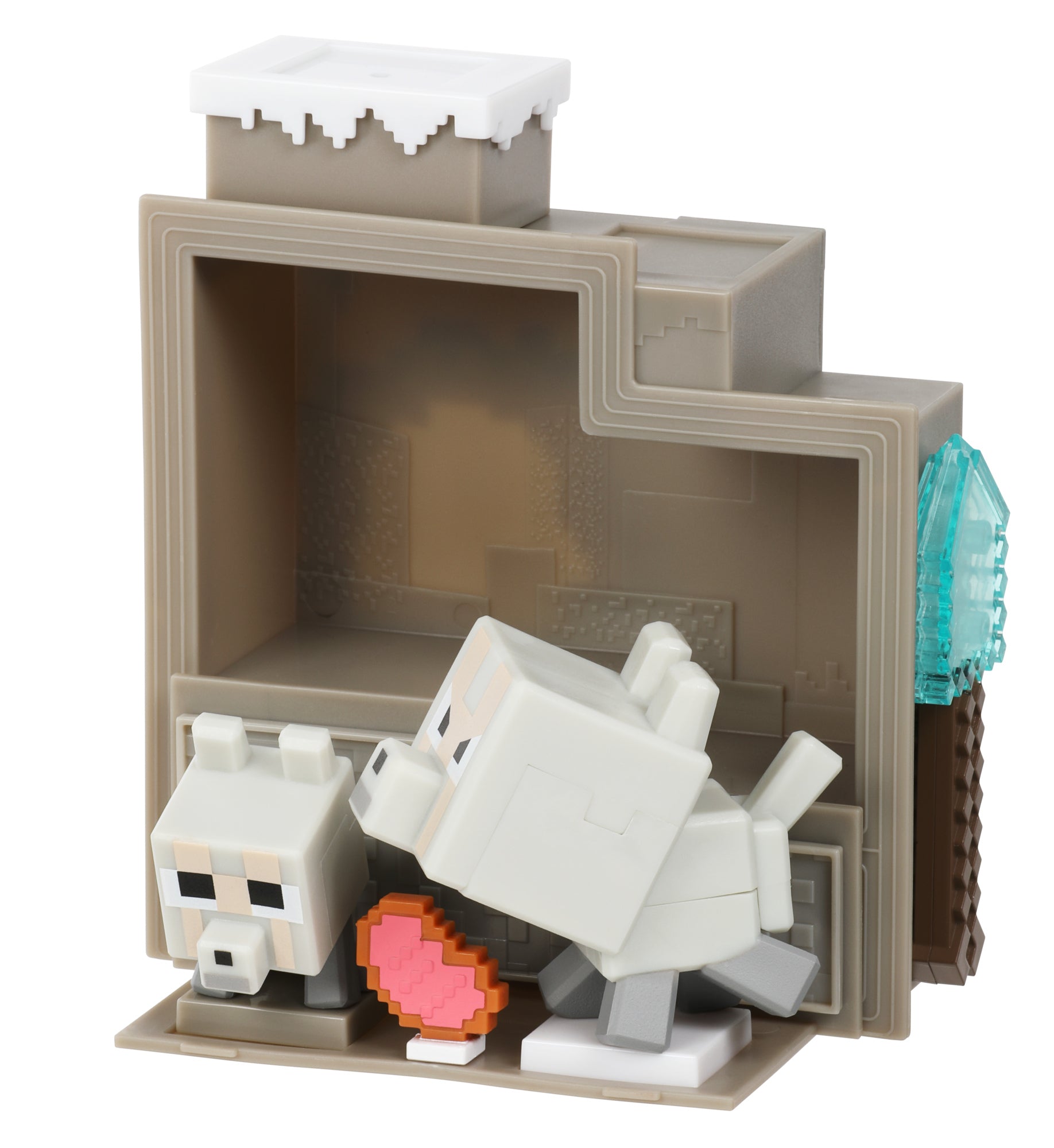 Craft your Characters using the Aqua Stick Hearts for no mess, instant crafting. Discover one of three Character Pairs in each pack. Mine for Explorer Steve and Baby Spider, Wild Wolf and Baby Wolf or Stray and Bat.