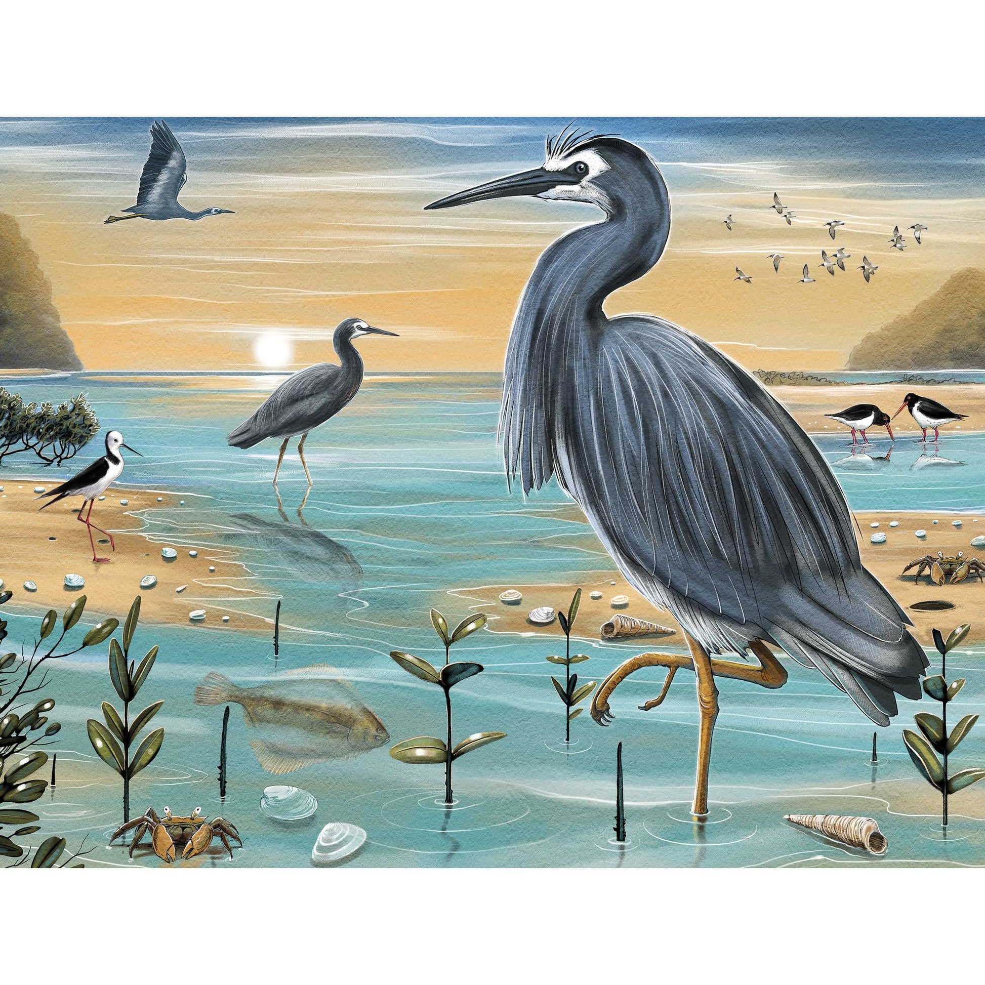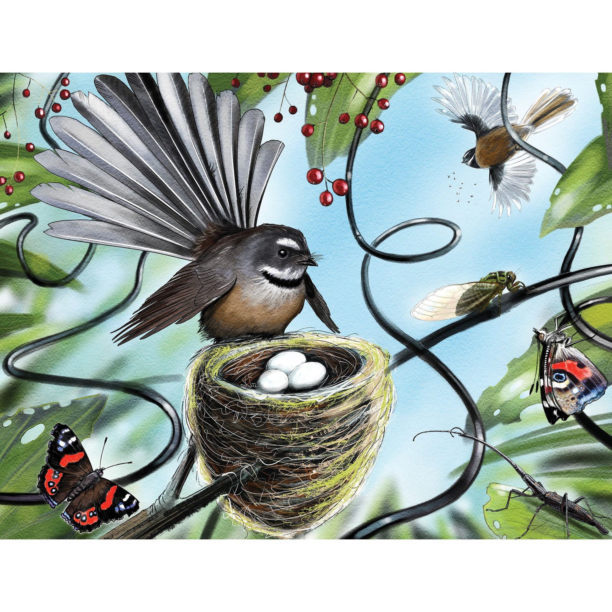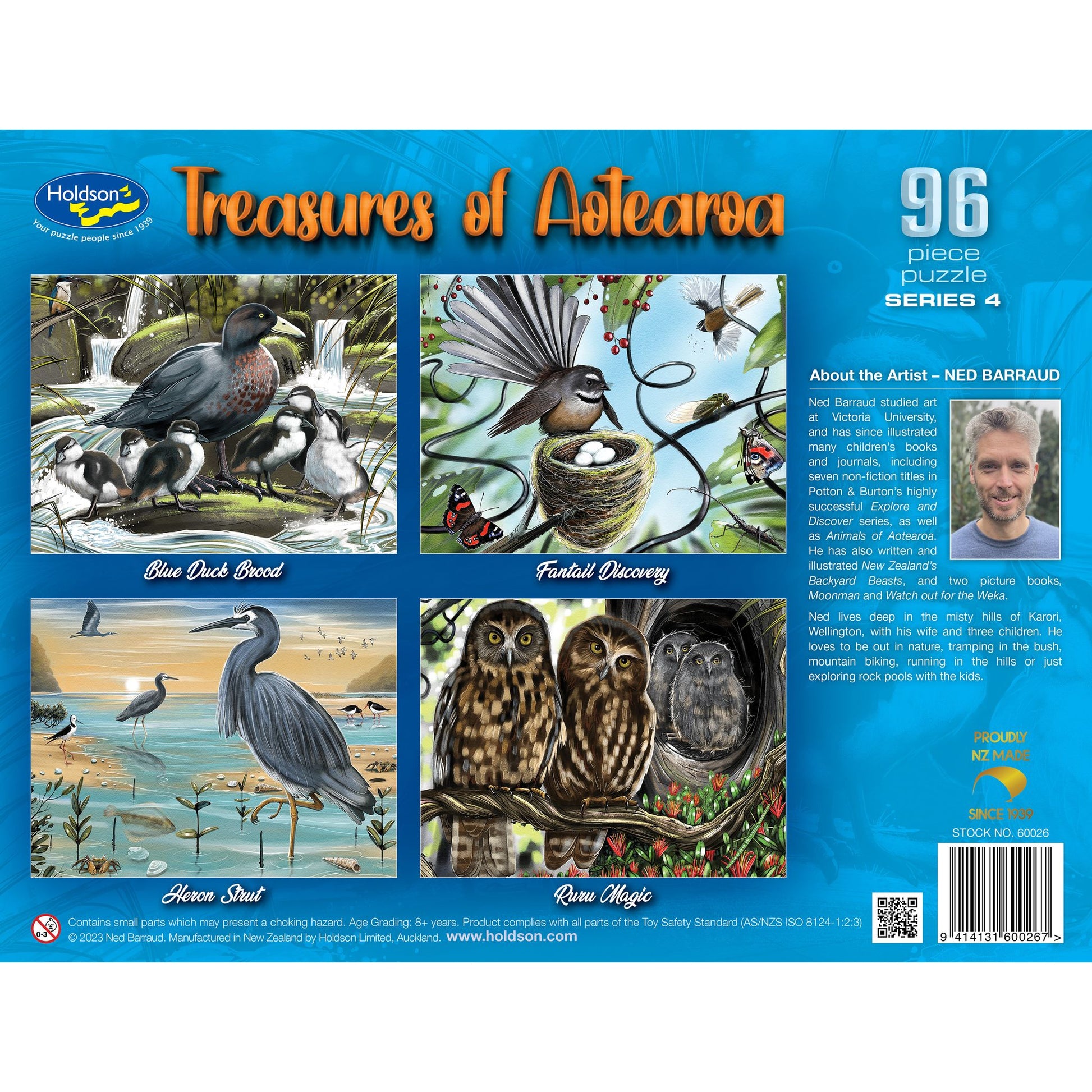 New Zealand artist and author Ned Barraud has created these gorgeous bird family frame tray jigsaw puzzle images for younger puzzlers. These make a fantastic learning tool, great for at home and in the classroom. Collect them all: Blue Duck Brood, Fantail Discovery, Heron Strut, Ruru Magic. Made in New Zealand by Holdson using vegetable based inks and recyclable materials. Each frame tray dimensions are approximately 338mm x 258mm. Suitable for ages 5 years+.