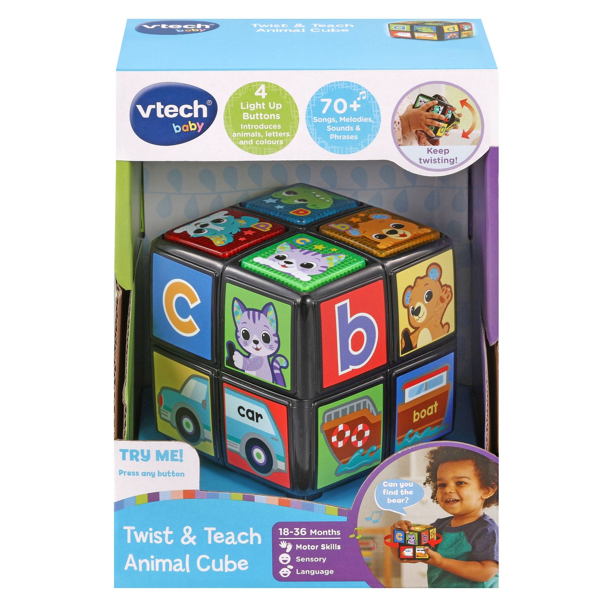 Cute, twisting cube made especially for babies. Turn the cube left or right to trigger fun learning phrases while being introduced to animals, phonics, vehicles and colours. 4 light up buttons on top of the cube encourage baby to interact, twist & discover. Cube can recognise different animal and vehicle combinations every time baby twists!